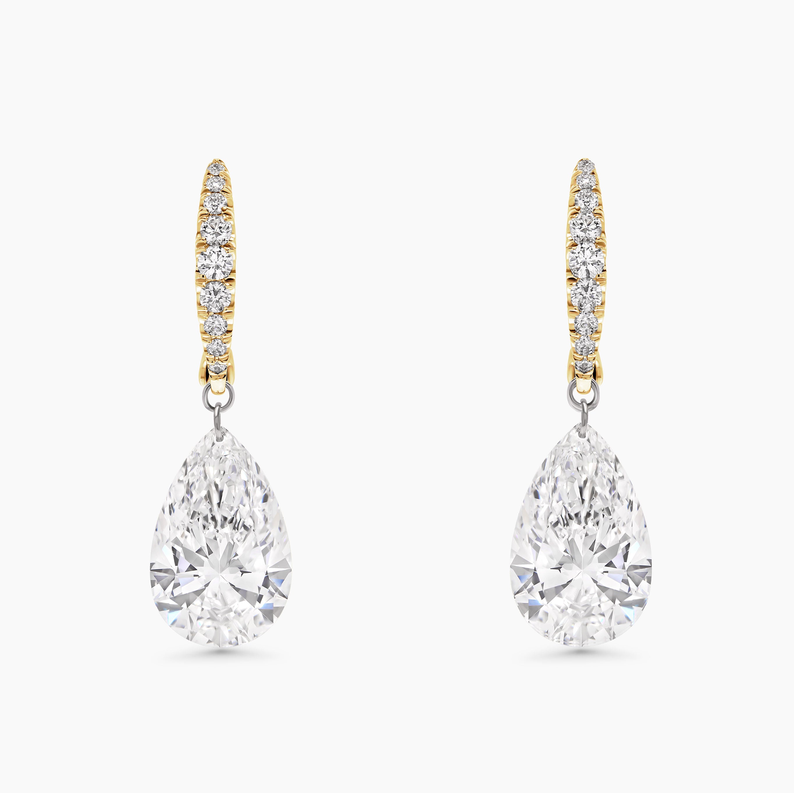 Elegant and full of movement, these earrings feature sleek lab grown diamond huggies paired with a dazzling pear shaped lab diamond that hangs freely below. The pear diamond is delicately drilled and connected directly to the huggie, creating a floating effect that shimmers with every step.