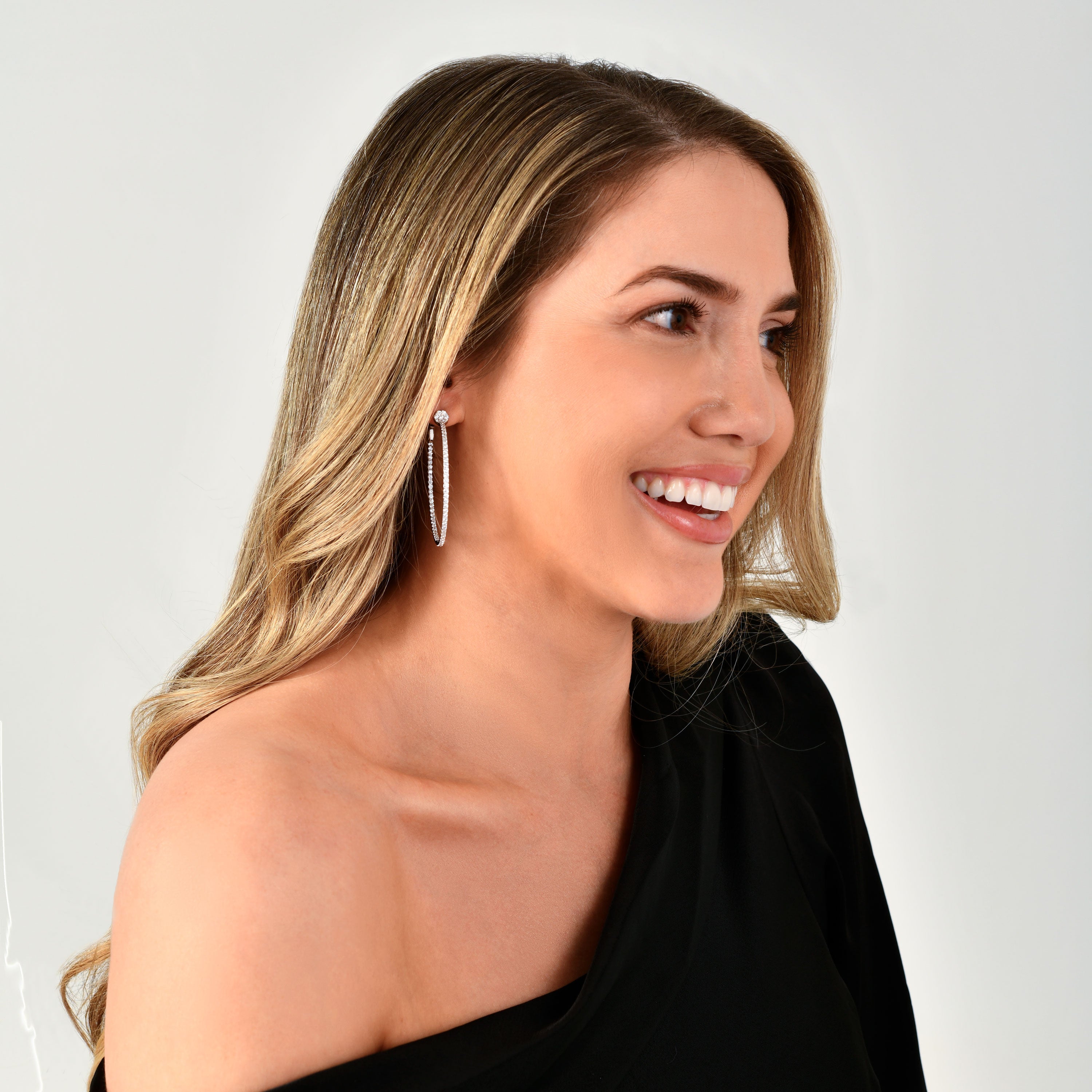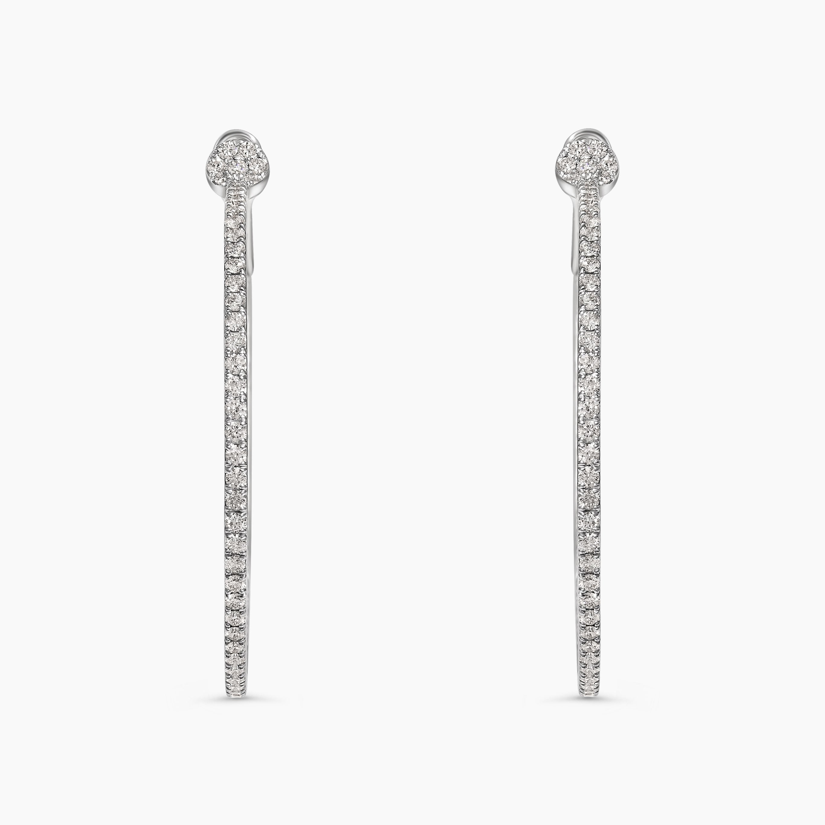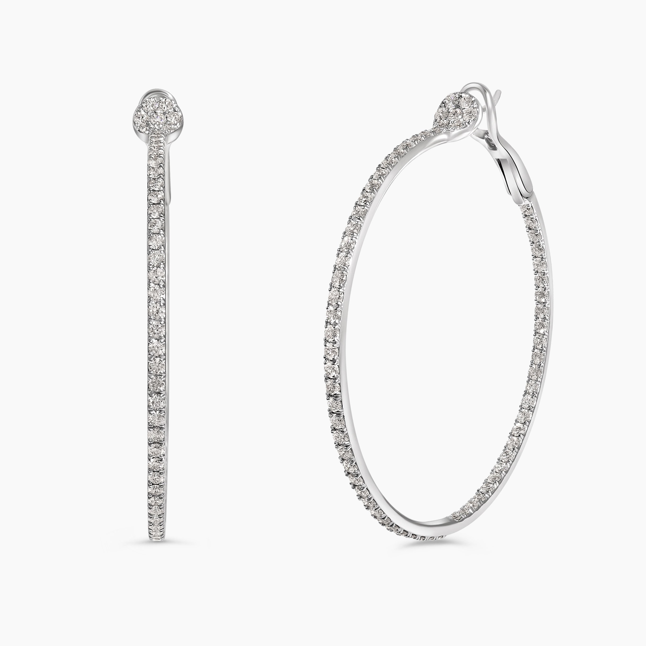 The Petal Lab Grown Diamond Hoop Earrings are a bold yet feminine statement, featuring large, striking hoops adorned with diamonds on both the inside and outside for a brilliant sparkle from every angle. The top of each earring is elegantly detailed with a subtle petal-shaped design, adding a soft, floral touch to the otherwise sleek, circular shape. This delicate petal detail enhances the overall femininity of the earrings, creating a sophisticated, modern look with a hint of nature-inspired beauty.