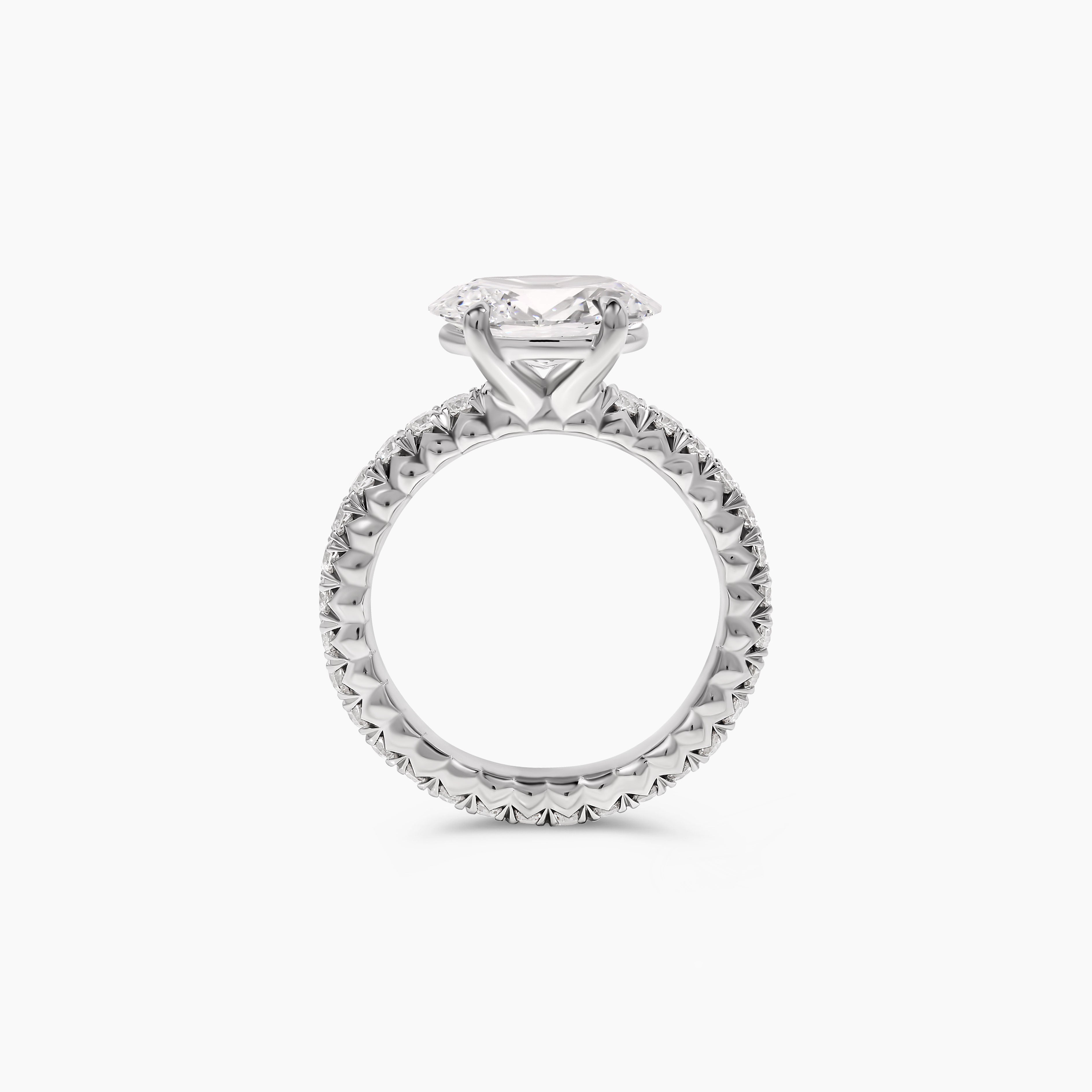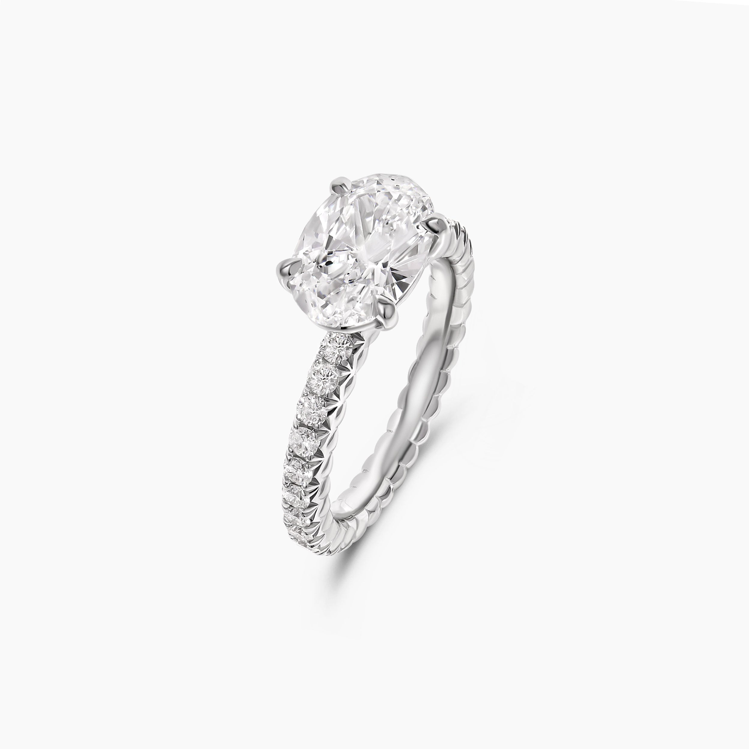 This east west oval cut diamond ring offers a modern twist on a timeless classic. The center oval diamond is set horizontally, creating a sleek silhouette that feels both distinctive and elegant. Along the band, round brilliant diamonds are meticulously French pavé set, revealing maximum sparkle with minimal metal for a refined, intricate finish. A design that balances sophistication with artistry, this ring is the perfect expression of modern luxury and lasting beauty.