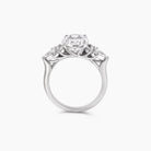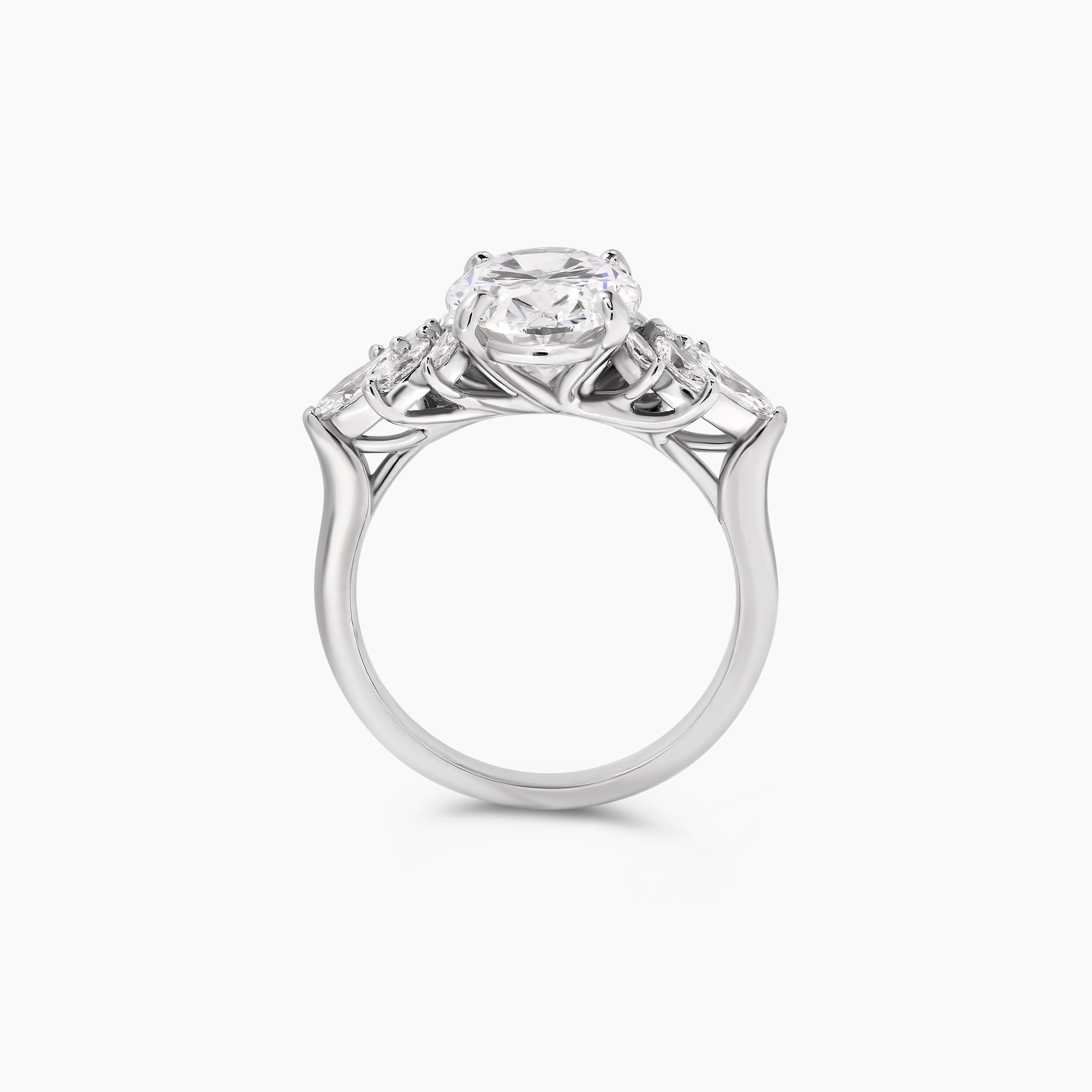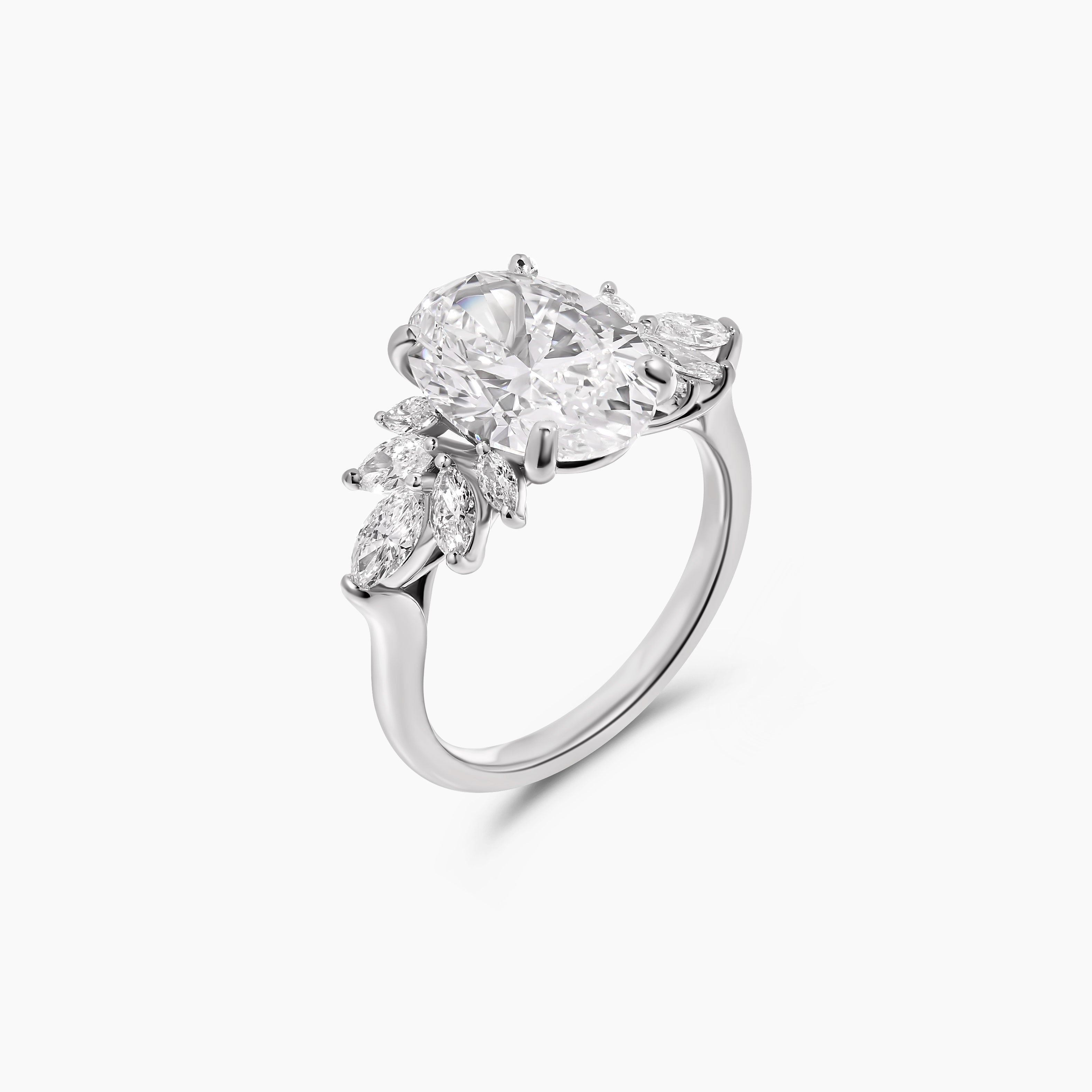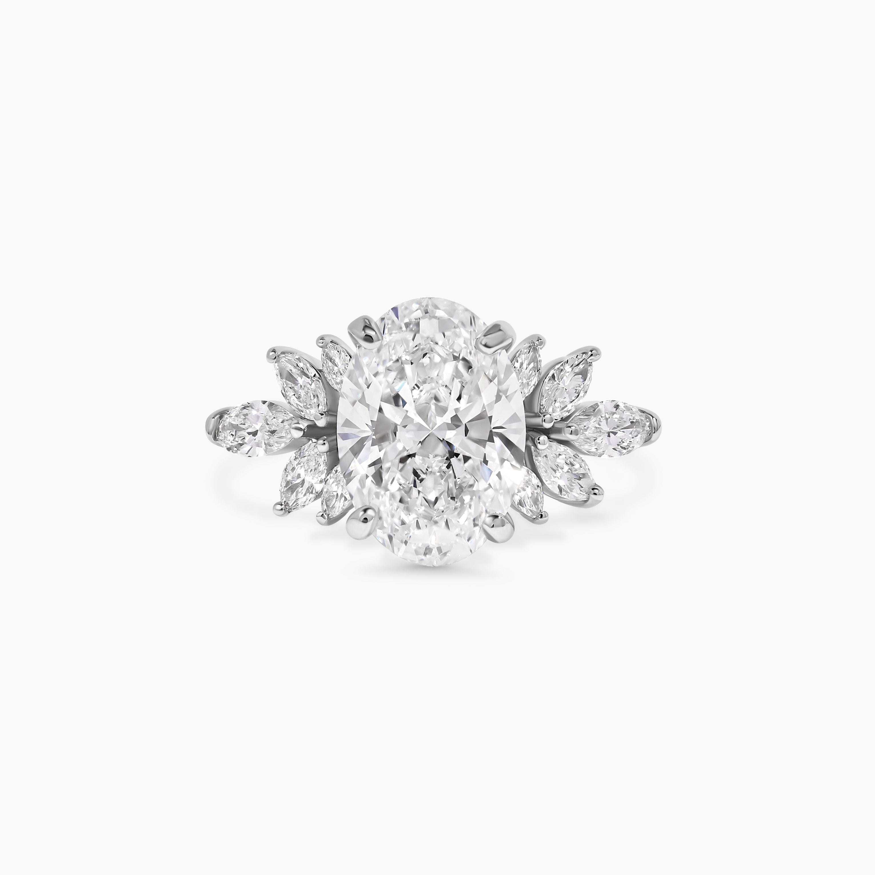 A celebration of brilliance and balance, this oval diamond ring is flanked by marquise side stones that frame the center with refined sparkle. The contrast of the oval’s gentle curves and the marquise’s elongated shape creates a graceful silhouette, offering a look of timeless elegance with a modern touch.