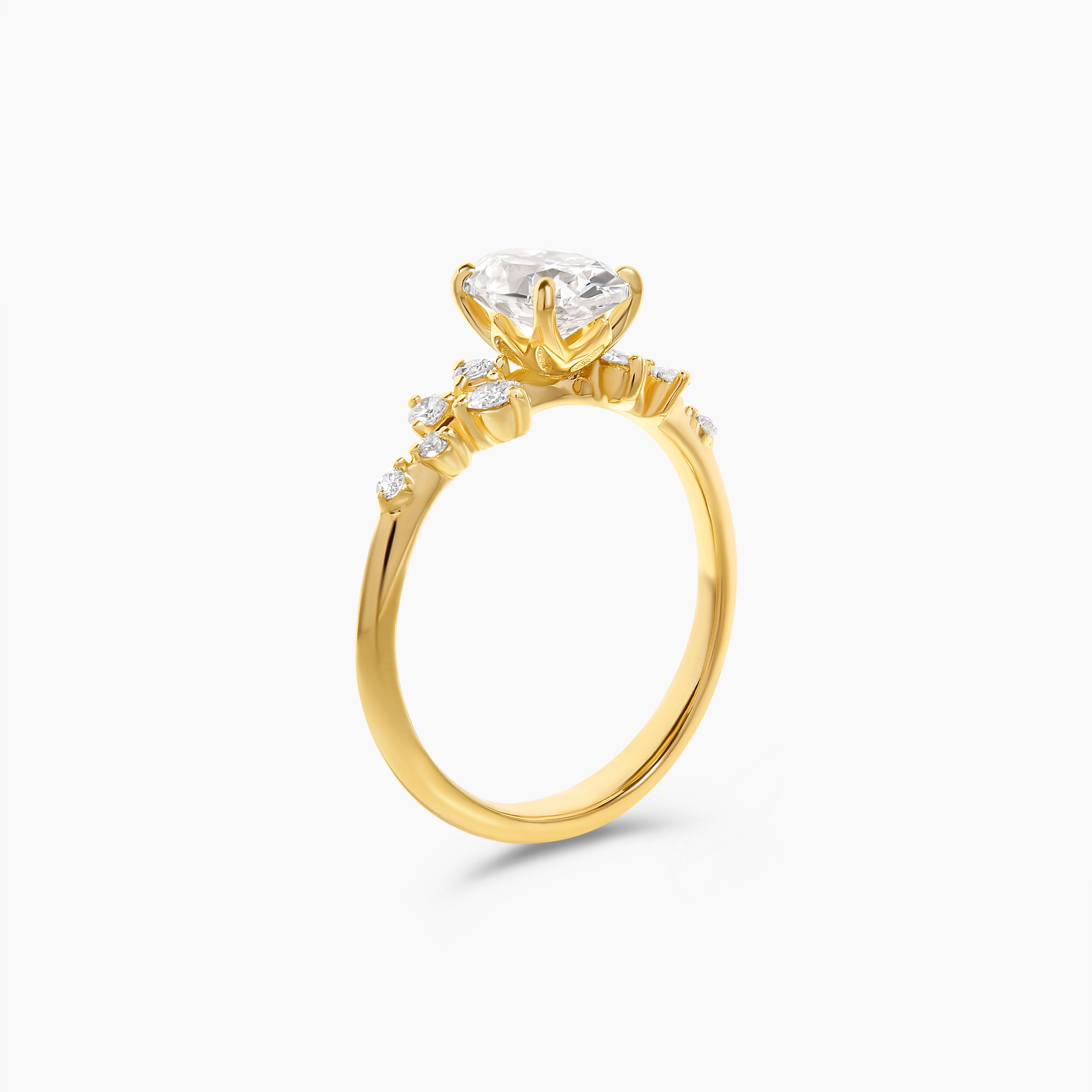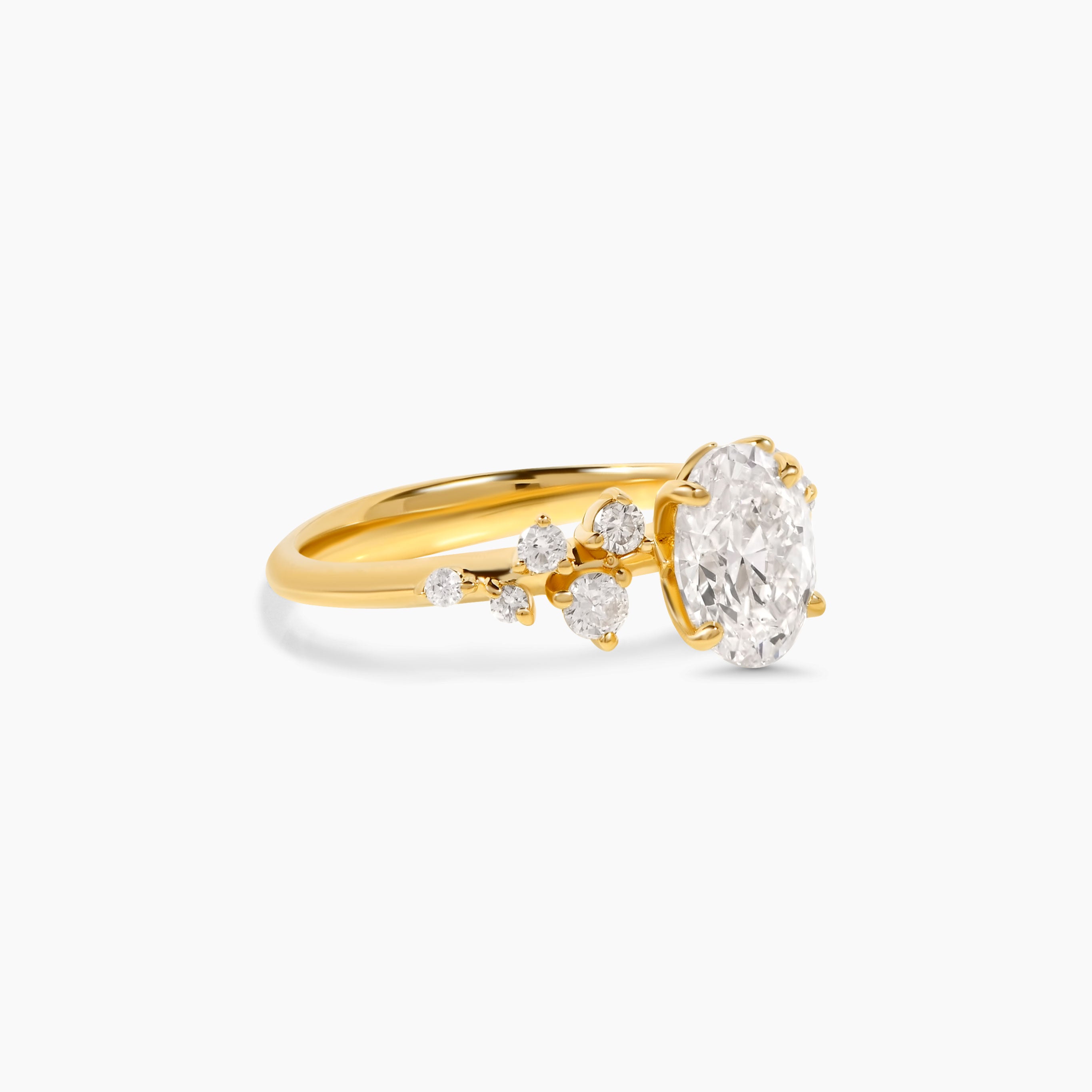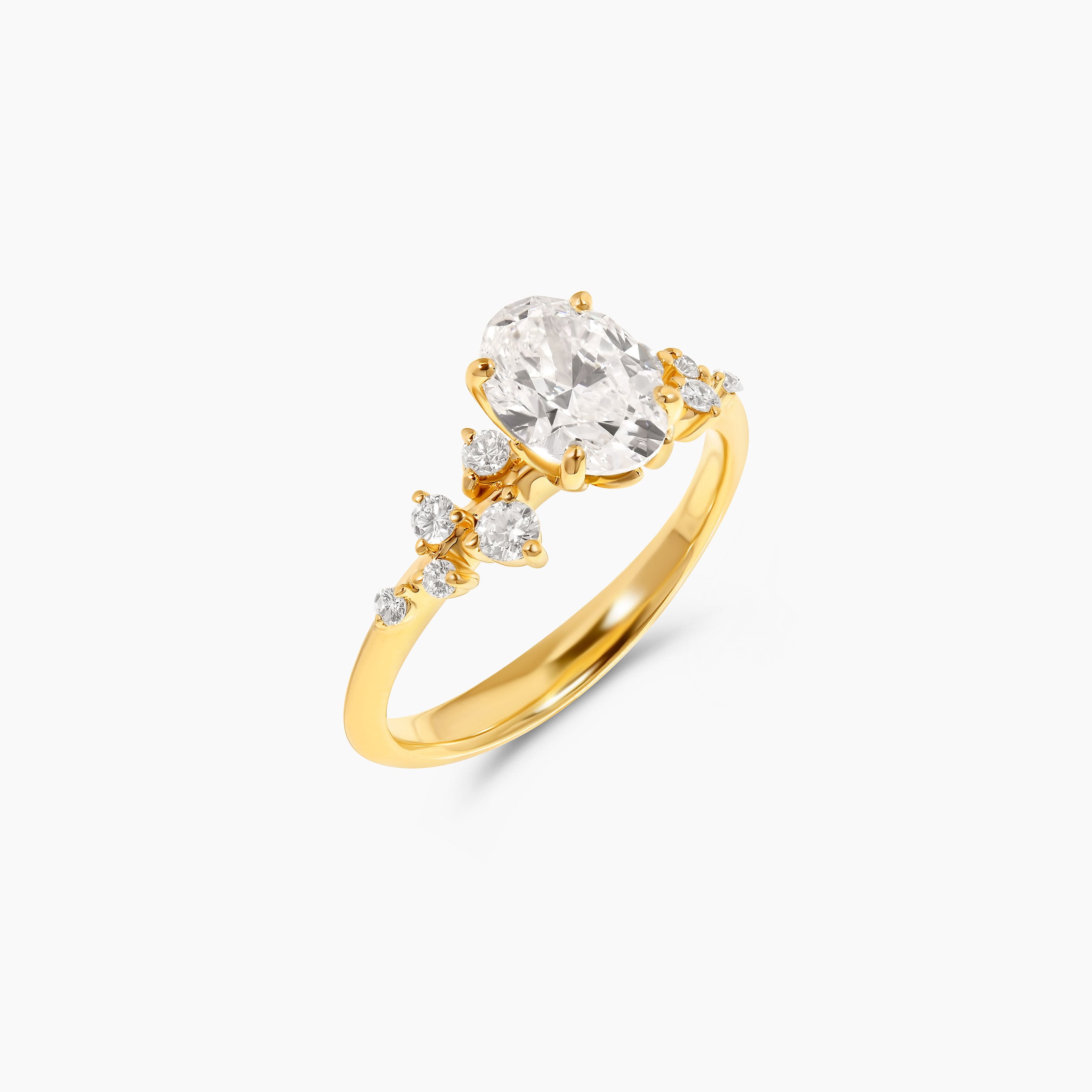 The Oval Cut with Galaxy Floating Diamond Engagement Ring is a breathtaking blend of elegance and celestial beauty. At its heart lies a stunning oval-cut diamond, gracefully surrounded by round diamonds that are meticulously arranged on both sides to mimic the enchanting sparkle of a galaxy. The floating diamond effect creates a sense of weightlessness, adding to the ring's ethereal charm. Set in warm gold, this ring exudes a dreamy, romantic glow, making it the perfect symbol of timeless love and radiant beauty.