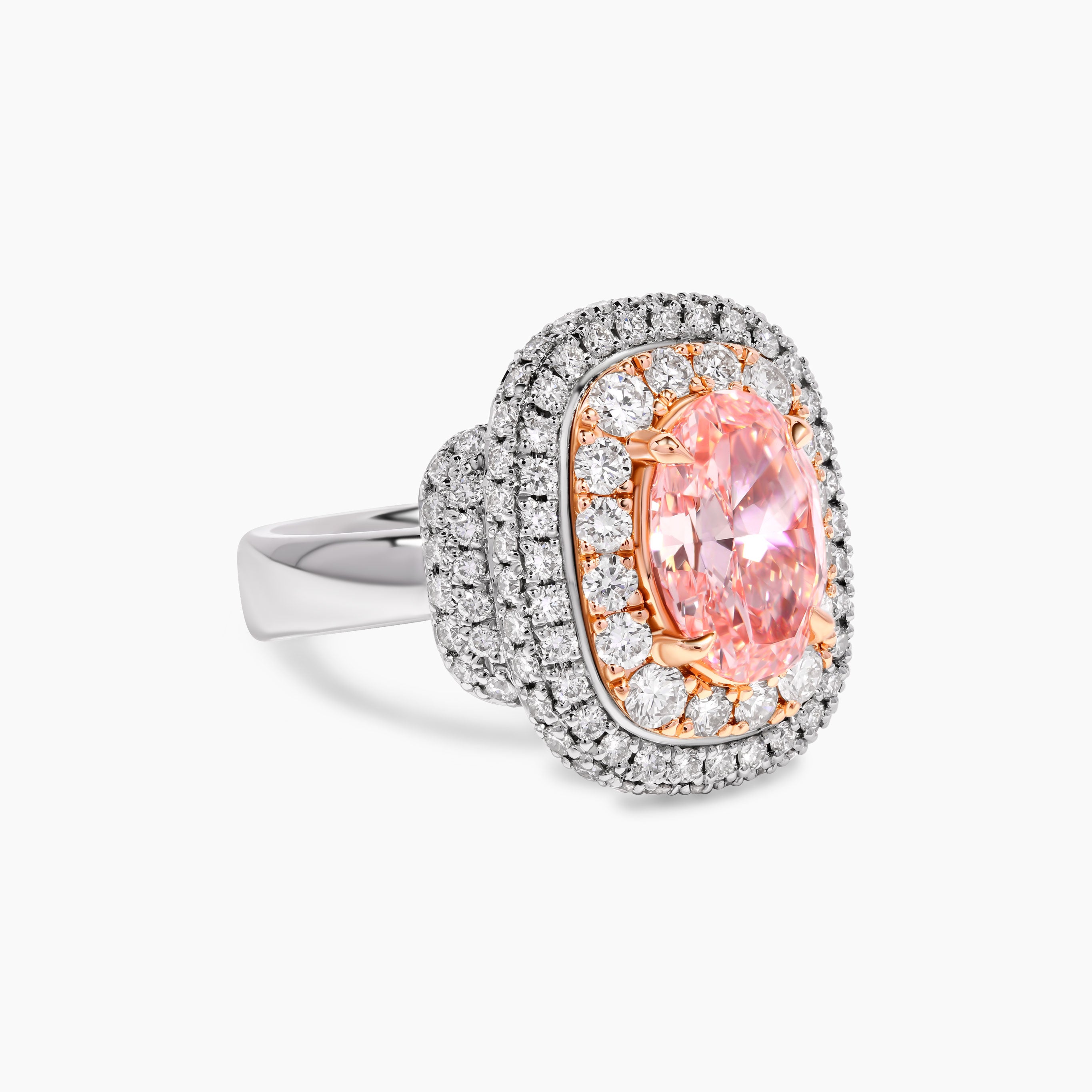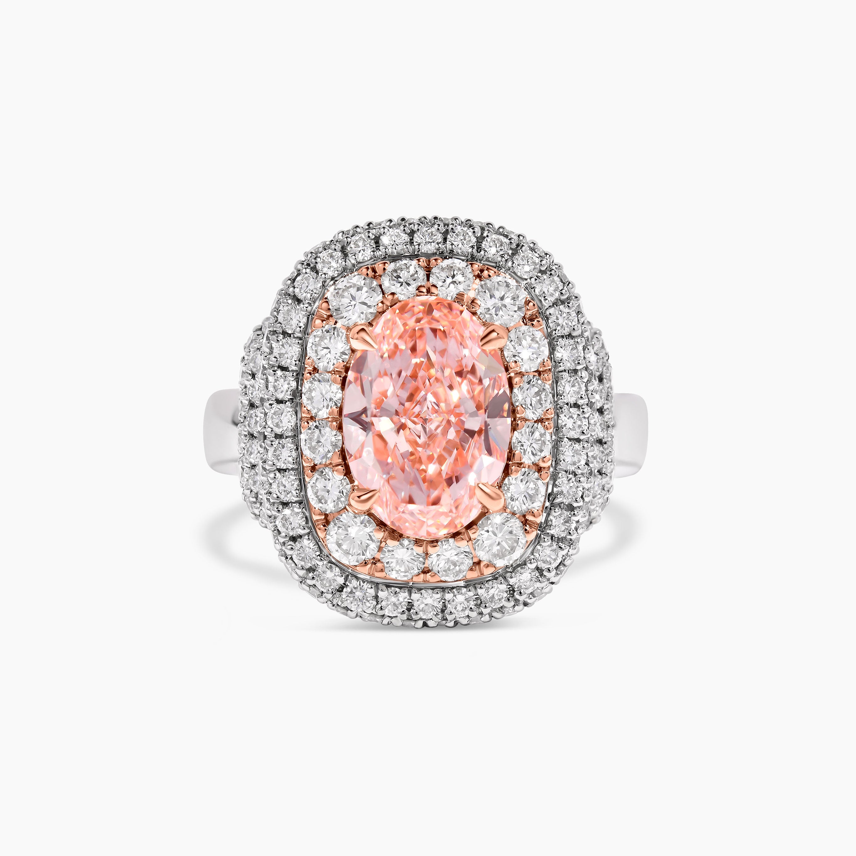 This exquisite ring showcases a beautiful oval lab grown pink diamond at its heart, held delicately by rose gold prongs. Encircling the vivid pink gem is a double halo of sparkling lab grown white diamonds. The blend of platinum and rose gold not only offers lasting strength but also highlights the soft, romantic hues of the center stone, making this piece truly unforgettable.