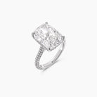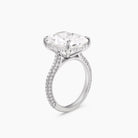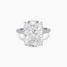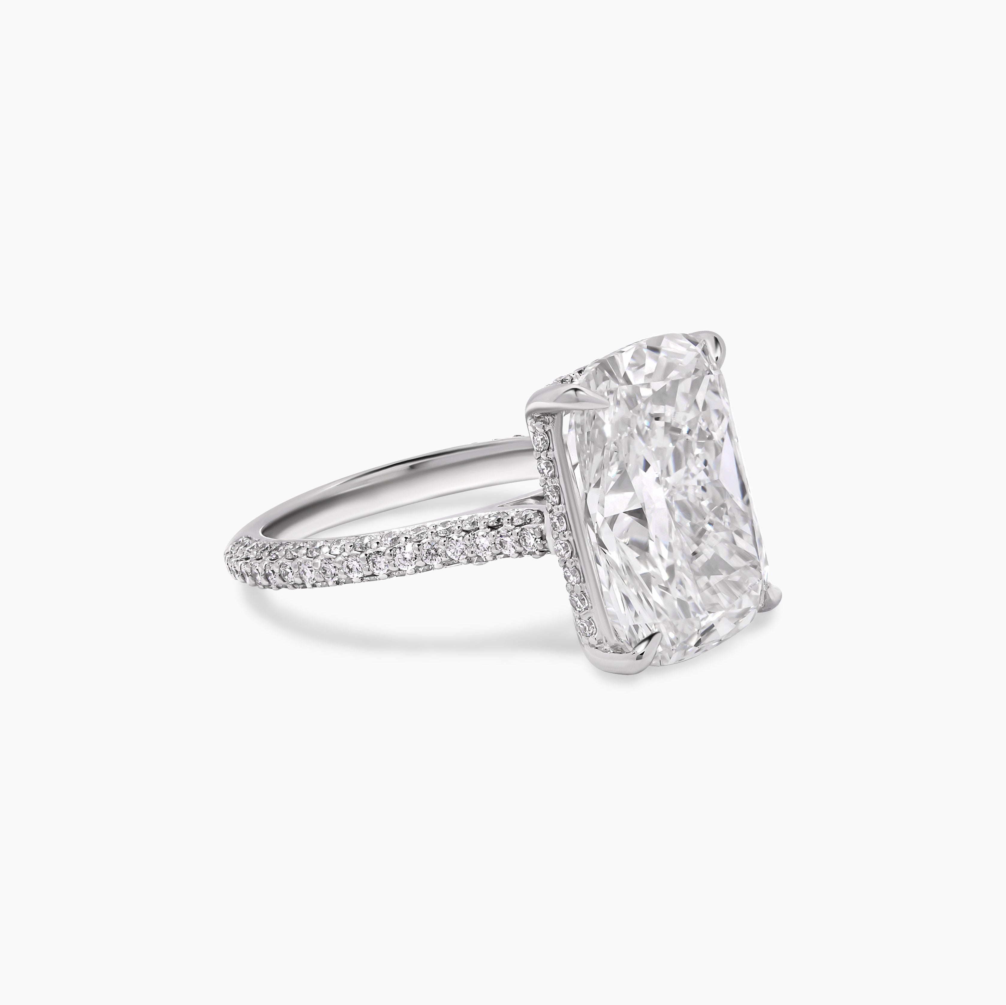 A breathtaking elongated cushion cut lab grown diamond, celebrated for its graceful shape and timeless sparkle. A delicate hidden halo enhances the brilliance of the center stone, while the sleek platinum setting and three rows of round diamonds on the band add depth, fire, and undeniable luxury.