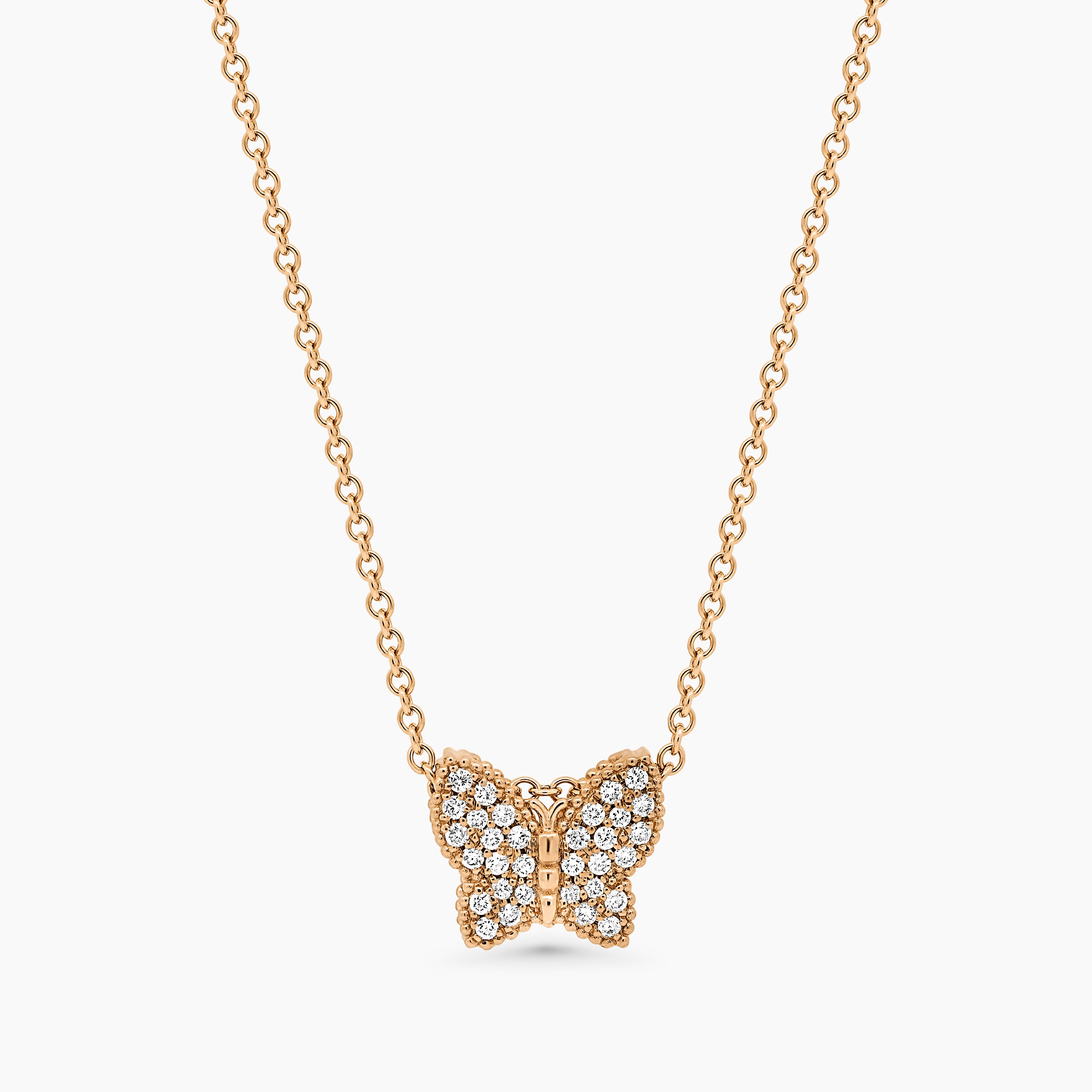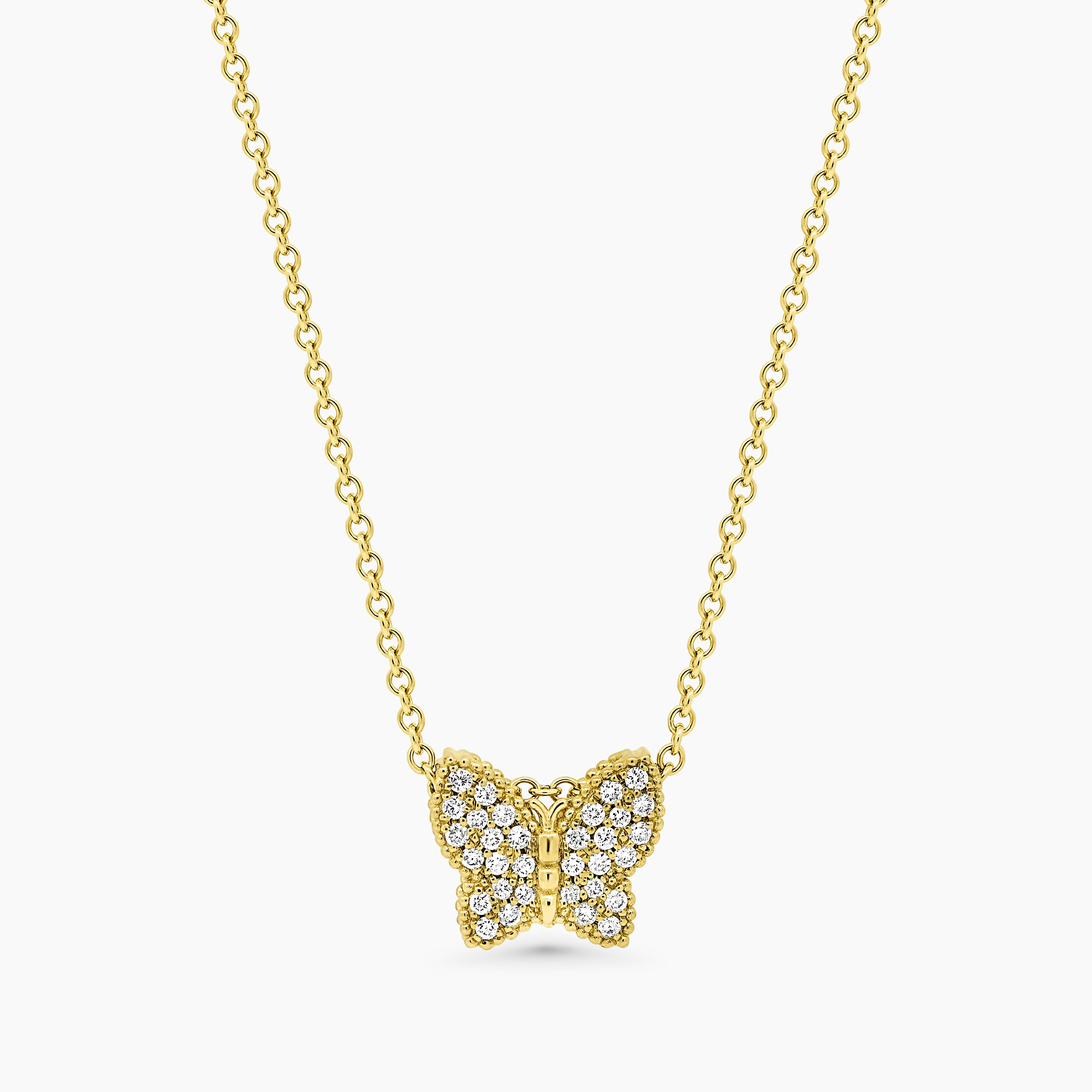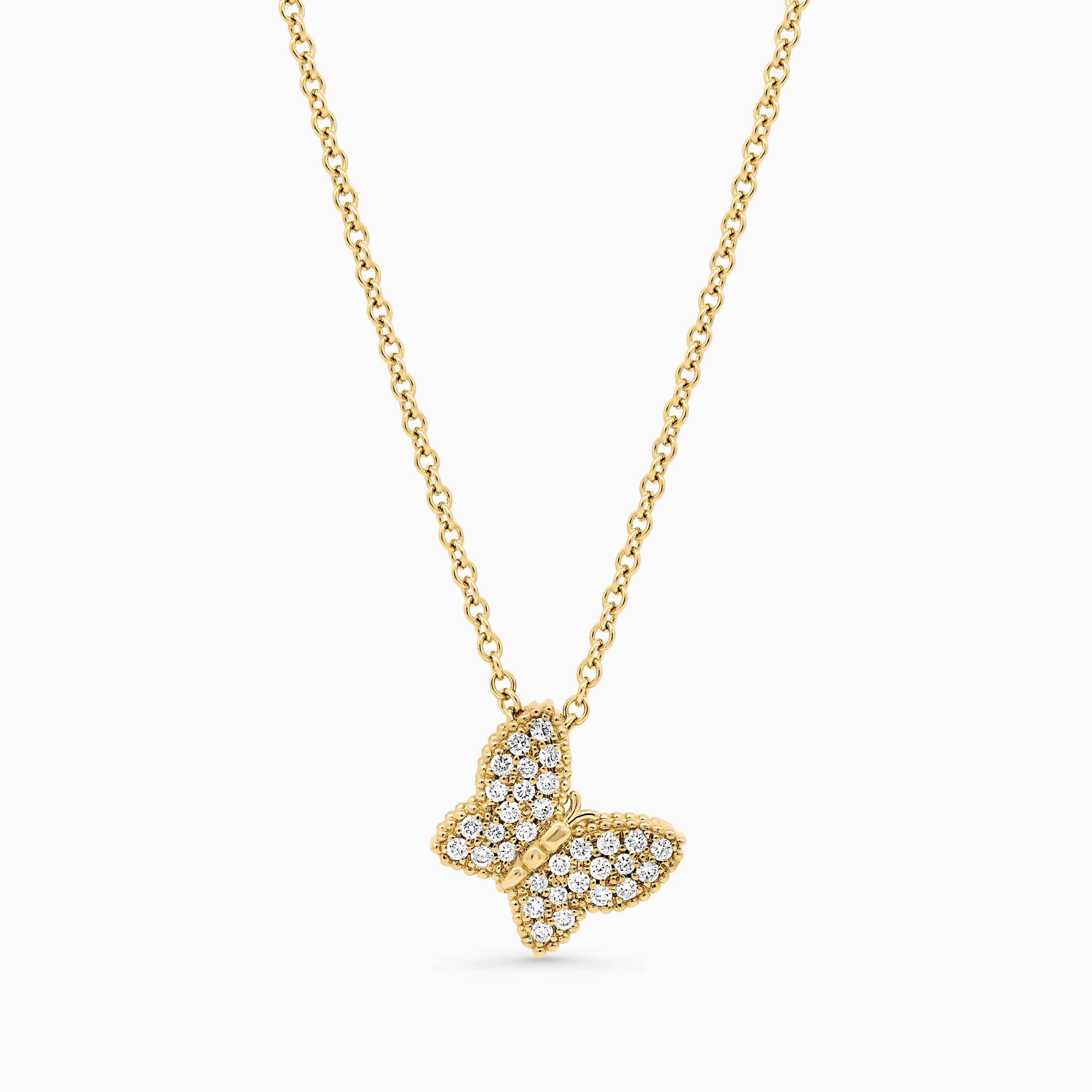 The Butterfly Diamond Pendant boasts an elegant design highlighted by stunning round-cut diamonds. Its exquisite artistry is further elevated by delicate beaded edges, creating a truly unique and sophisticated accessory. Whether worn straight or tilted, this pendant adds a touch of personalization to any outfit.