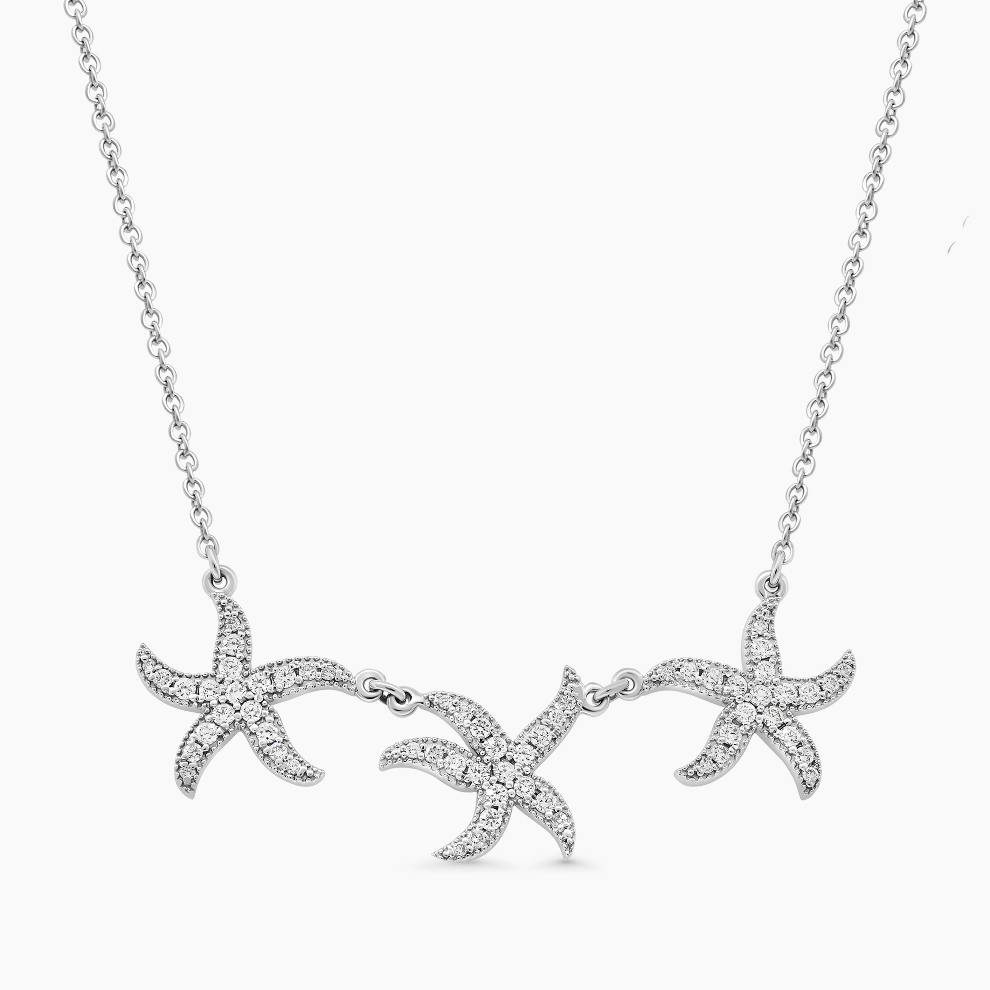 Bring a little bit of the ocean to your wardrobe with this Dancing Starfish Necklace. Three lovely starfish are adorned with sparkling round brilliant-cut diamonds, giving them a lifelike and enchanting quality. The gentle swaying of the starfish adds a whimsical touch to any outfit.