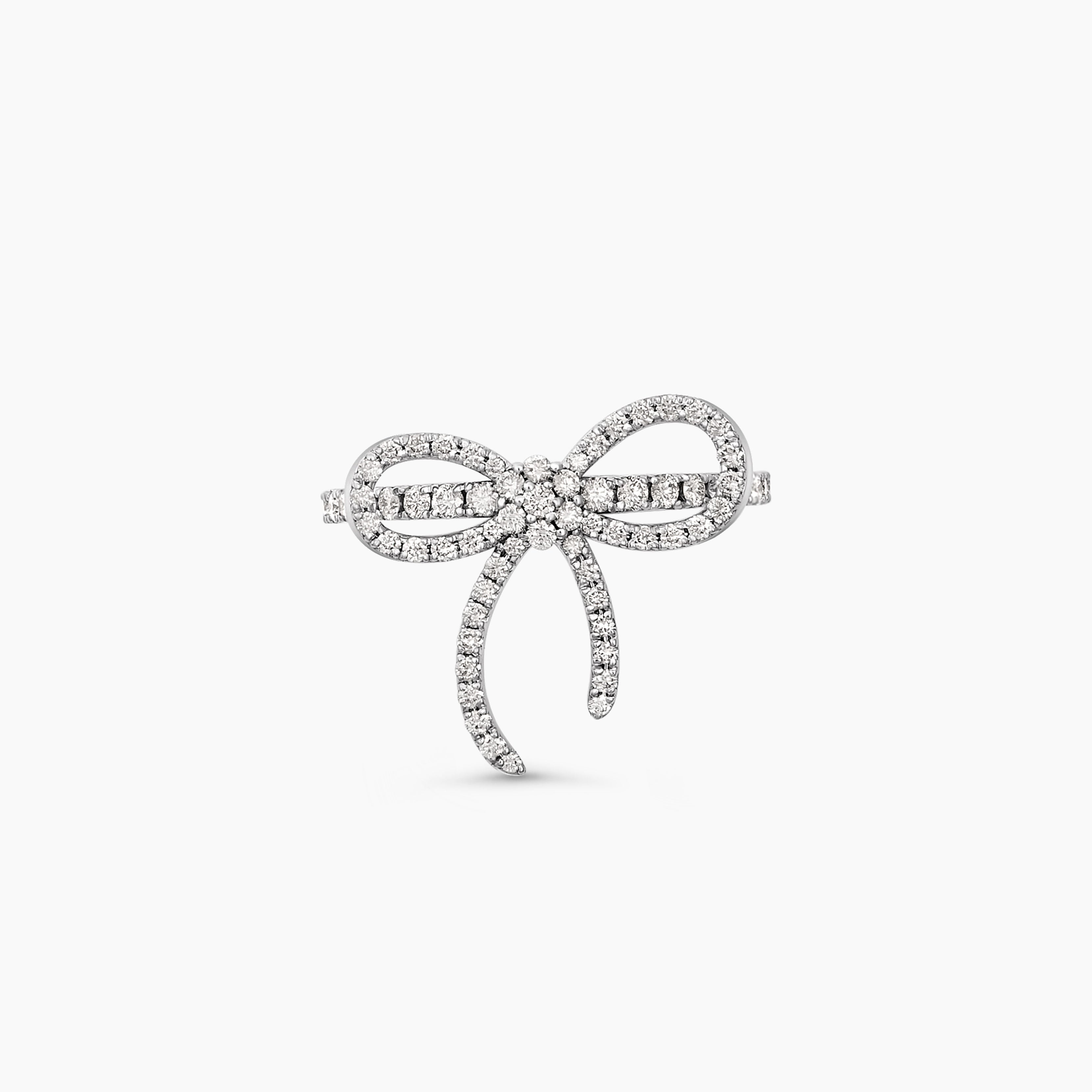 Introducing our stunning diamond bow ring, a delightful piece that combines elegance with a playful twist. Crafted in lustrous white gold, this ring features a charming bow design adorned with sparkling round brilliant cut diamonds.