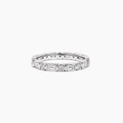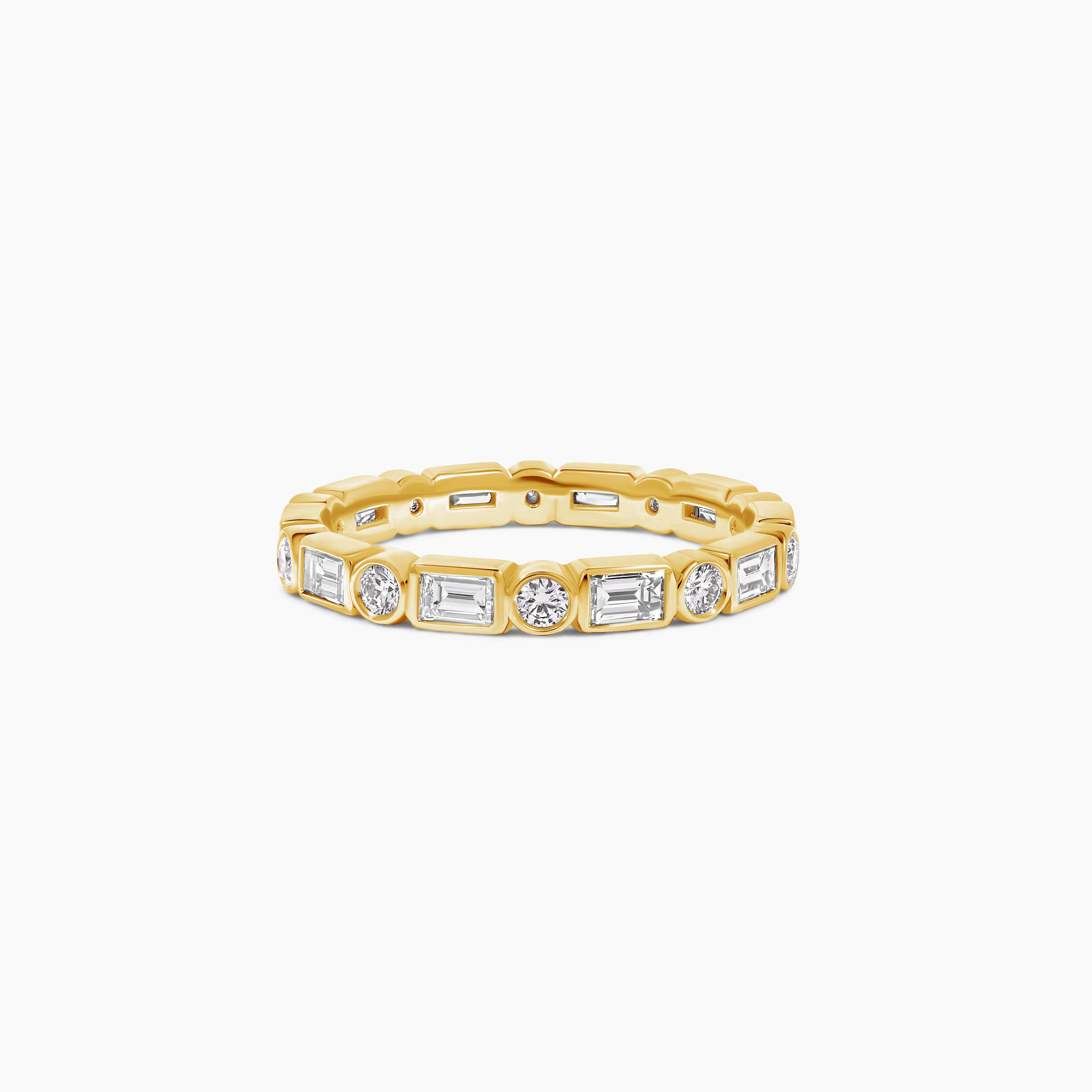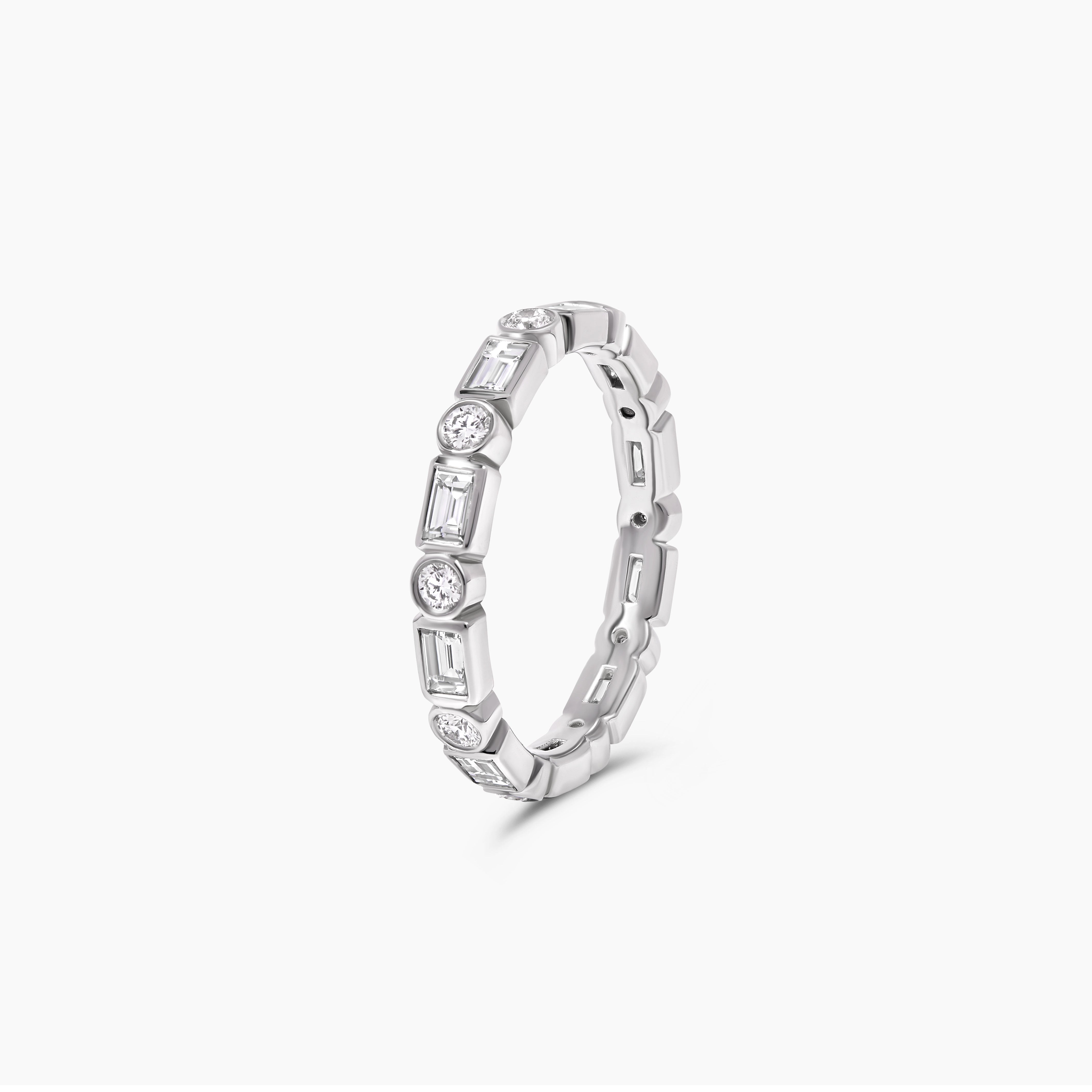 Elegant and versatile, the Round and Baguette Lab Grown Diamond Bezel Eternity Band features an alternating pattern of round brilliant and baguette cut diamonds, each securely set in a sleek bezel. The combination of shapes creates a modern yet timeless look, while the full eternity design offers continuous sparkle from every angle.