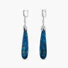 Sea-glass blues with elegant presence. Smooth chrysocolla drops are finished with a polished white-gold cap accented by a diamond, then suspended from petite diamond huggies. The elongated, dangle silhouette offers a graceful swing and statement length—perfect when you want color and sparkle that’s meant to be seen.