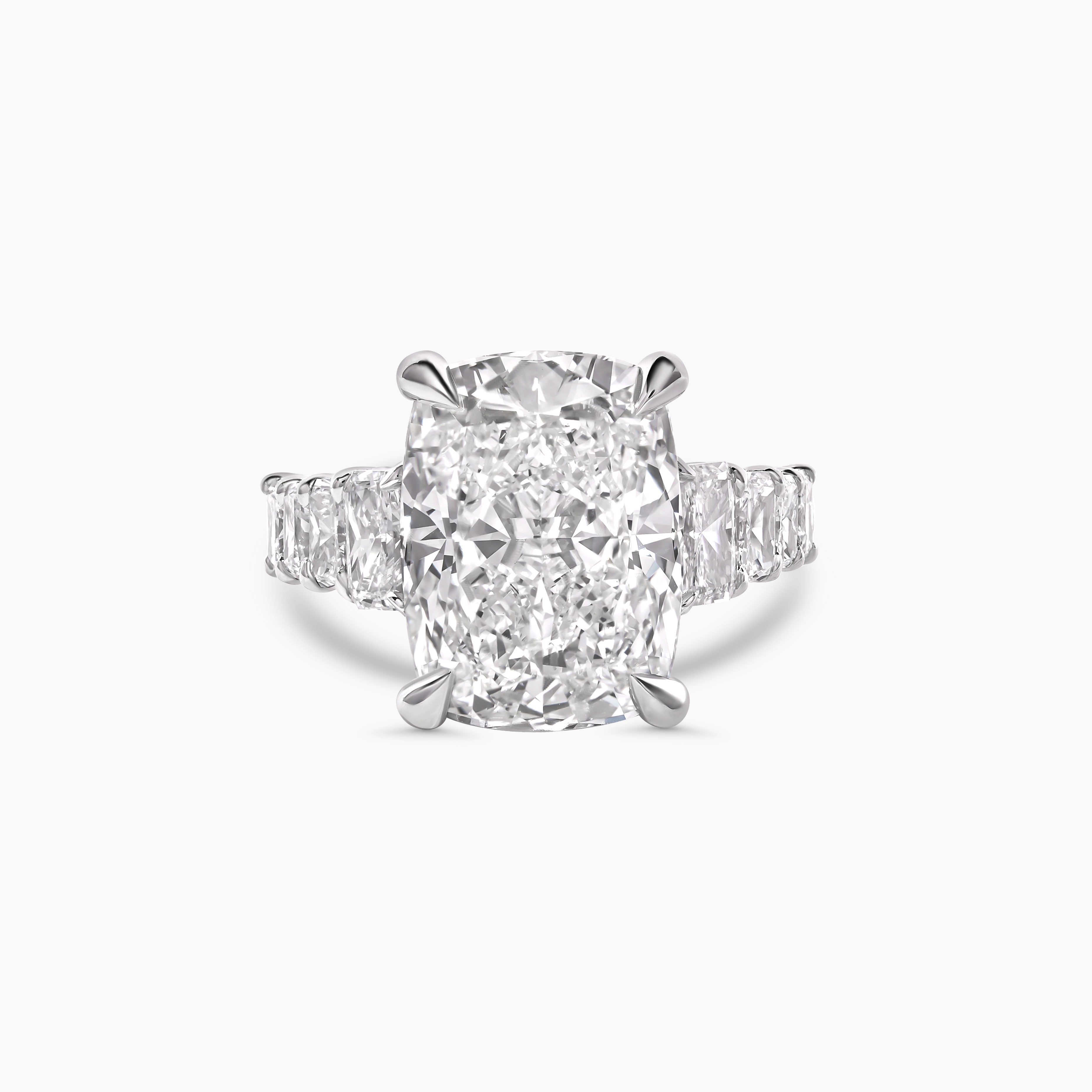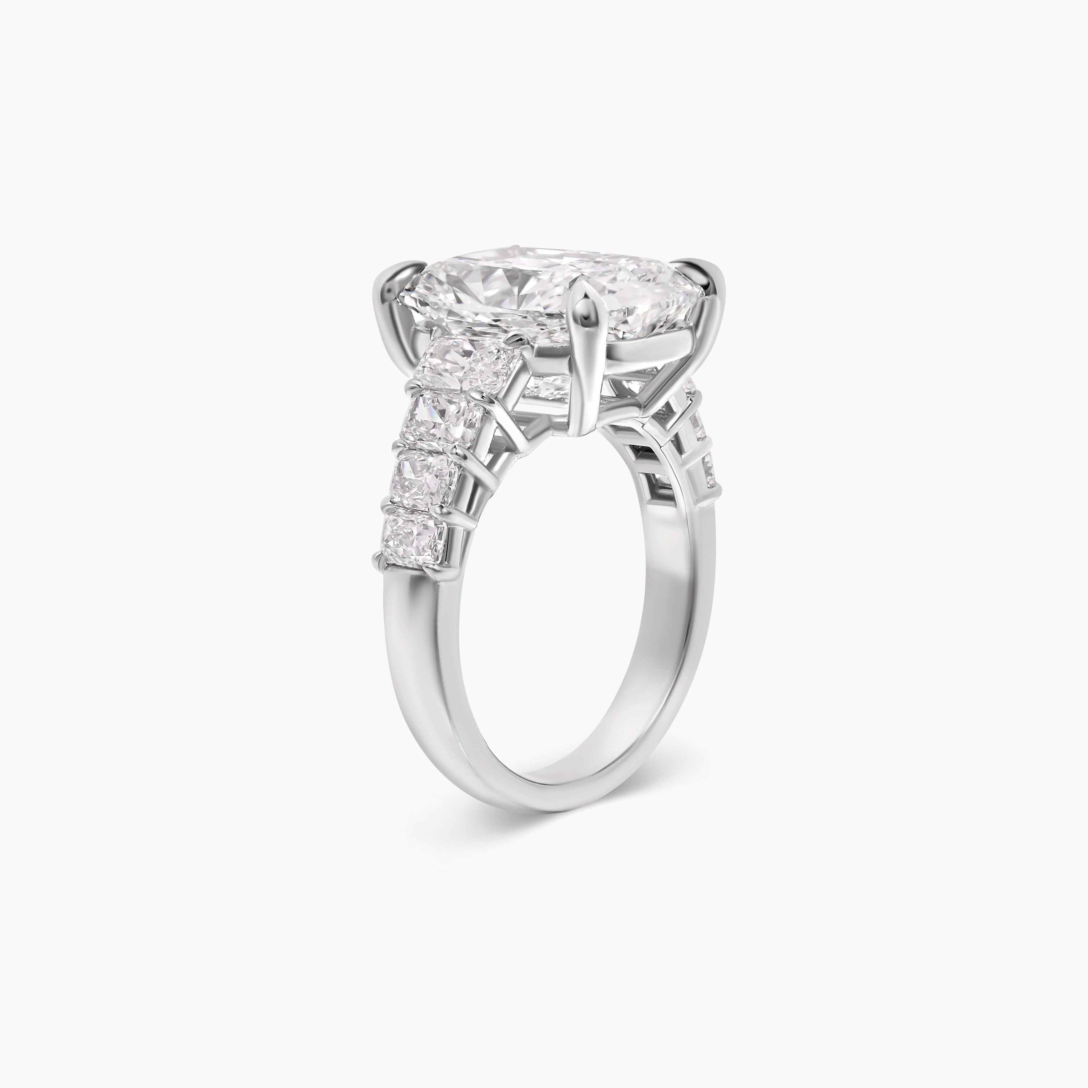This Cushion Cut Lab Grown Diamond Ring with Radiant Side Diamonds features a glowing cushion cut center complemented by radiant side stones for added brilliance. Set in platinum, it offers a timeless yet modern look, perfect for an engagement ring or elegant statement piece.
