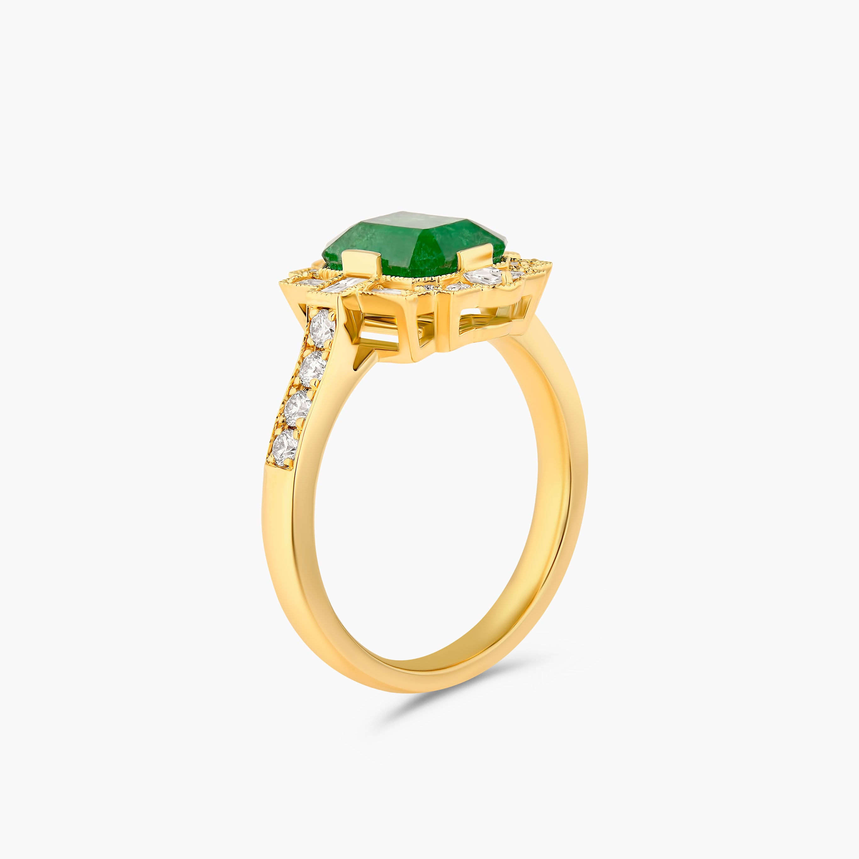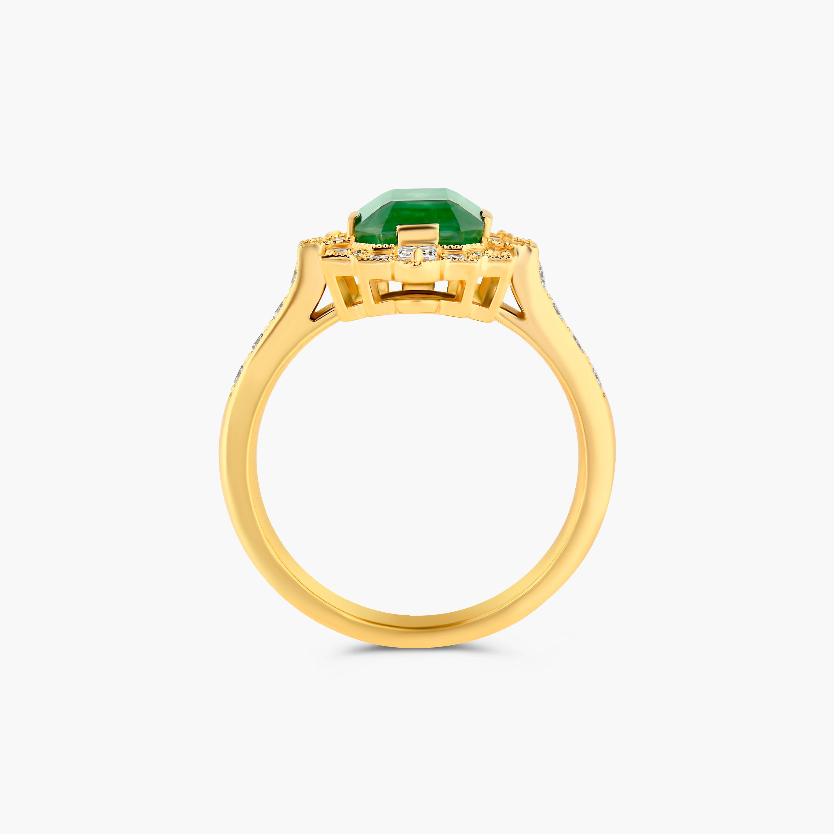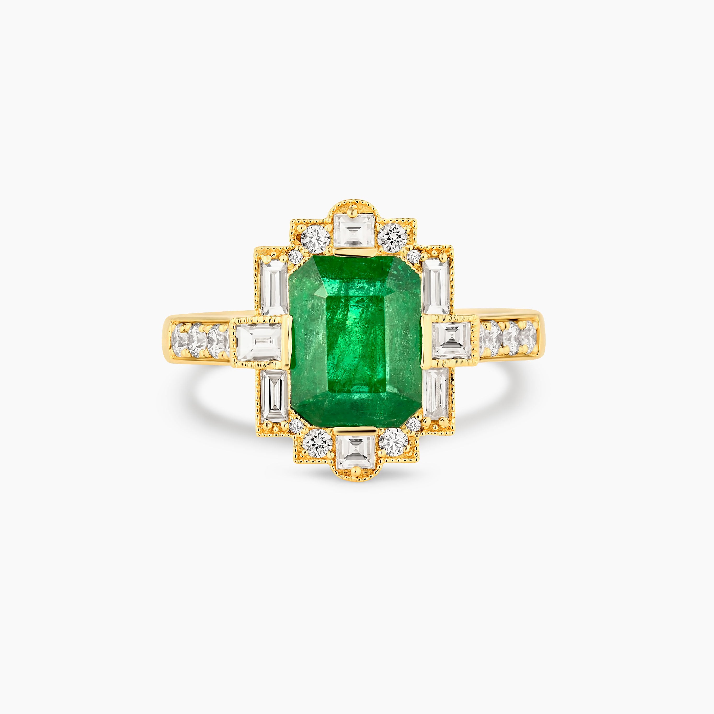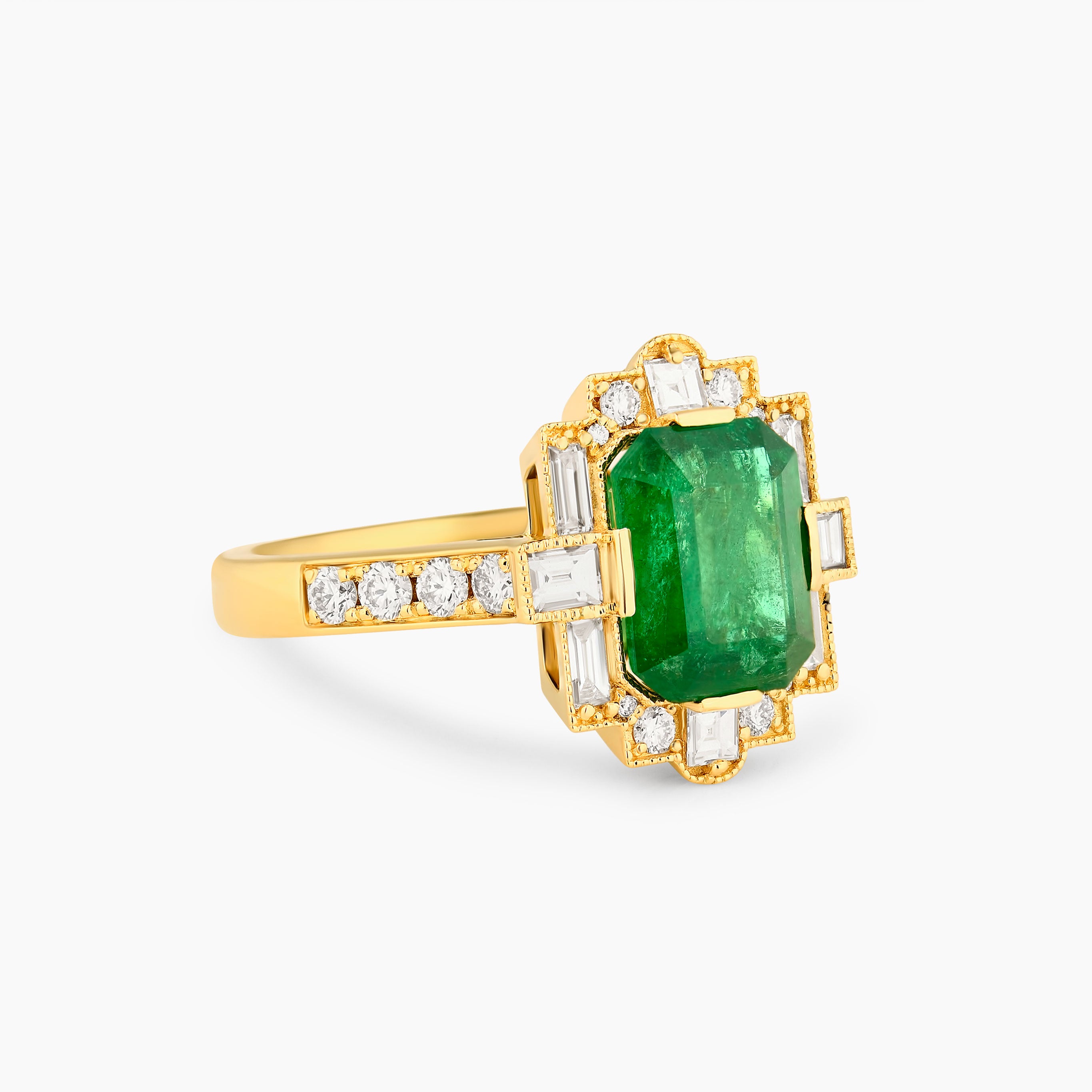 This vintage-inspired Emerald and Diamond Vintage Style Ring is reminiscent of the elegant Art Deco period. Its symmetrical design exudes timeless luxury and is highlighted by a brilliant emerald, accompanied by baguette and round diamonds that enhance its vintage charm. The luscious gold band complements the deep green hue of the emerald, creating a captivating contrast. This ring epitomizes classic sophistication and is the perfect statement piece for those who appreciate the allure of vintage style.