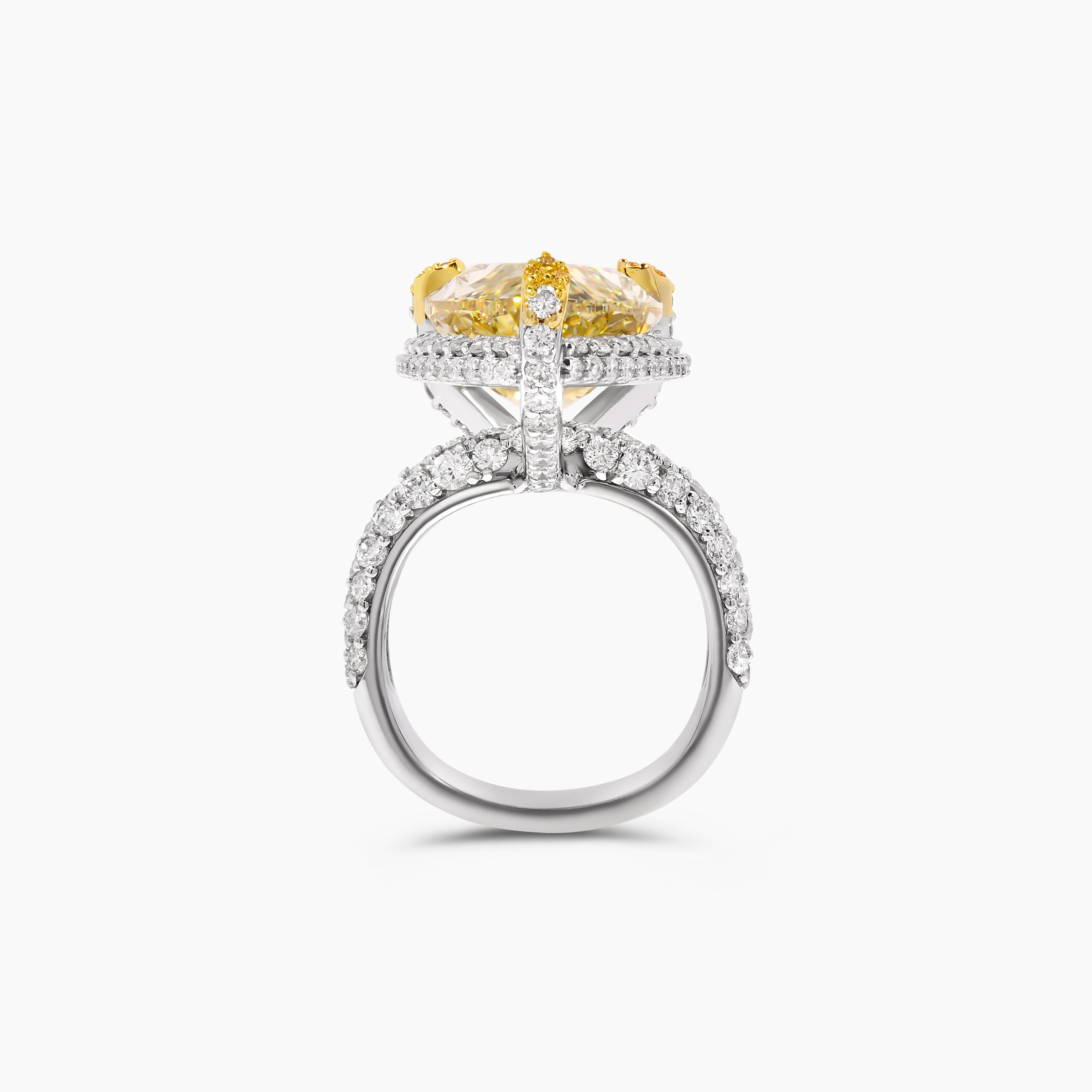 The Golden Radiance ring captures the warmth of light in an elegant design. At its center shines a lab-grown pear shape yellow diamond, its golden hue enhanced by yellow diamond prongs for a seamless glow. The platinum band is lined with three rows of round brilliant diamonds, adding depth, fire, and sophistication to every angle.