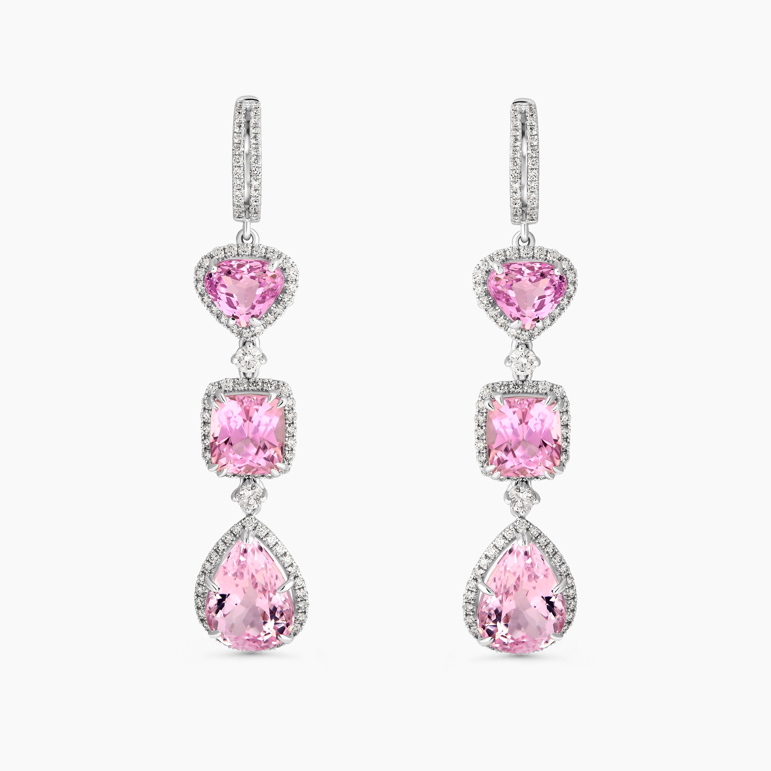 These Kunzite and Diamond Drop Earrings are a dazzling combination of elegance and color. Each earring features three carefully selected kunzite stones in heart, cushion, and pear shapes, all encircled by a brilliant diamond halo. The soft pink tones of the kunzites create a beautiful contrast with the sparkling white diamonds, making these earrings a standout accessory for any special occasion.