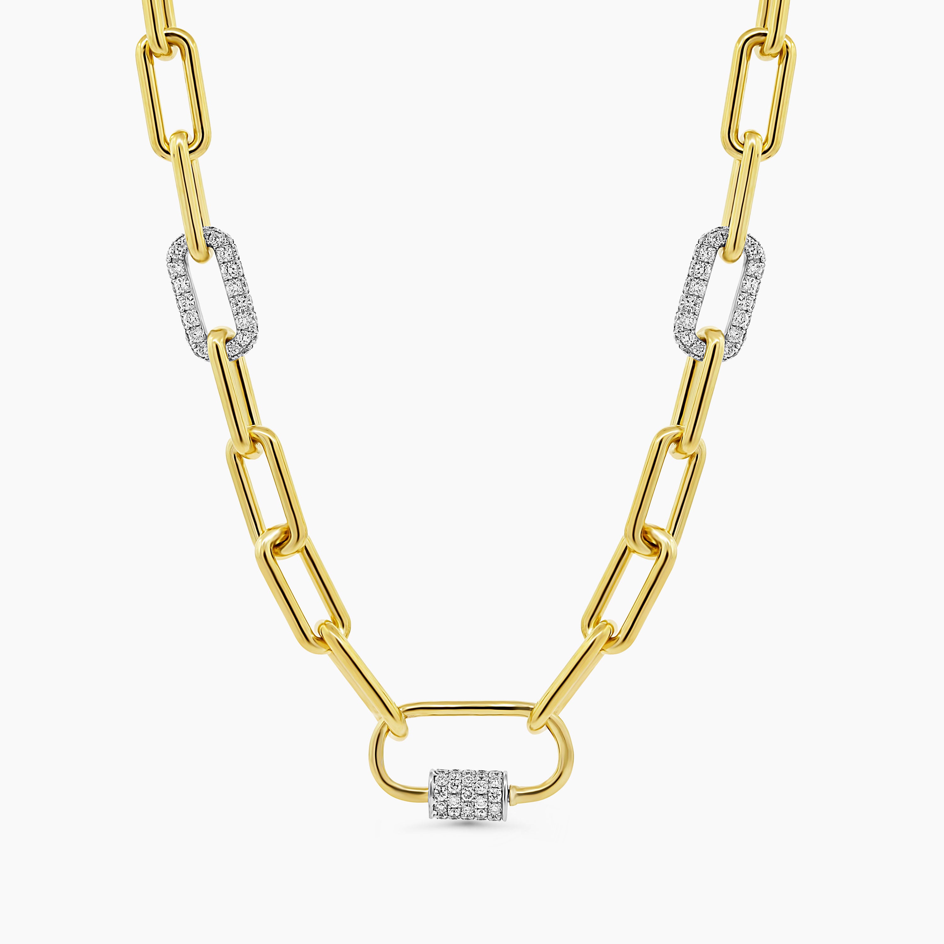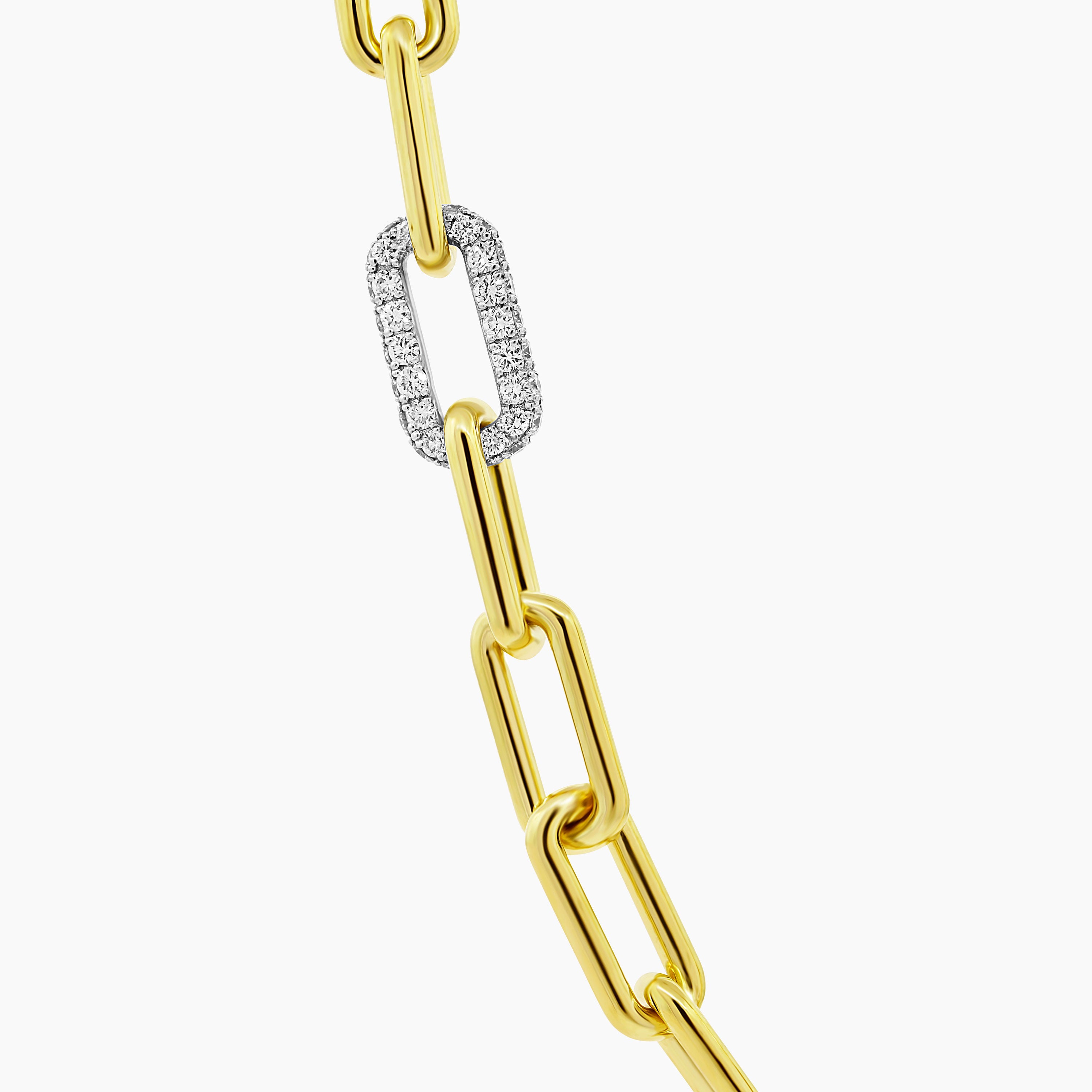 The Paper Clip Diamond Chain offers a unique twist on the classic paper clip chain trend. Featuring alternating links of sparkling diamonds and solid gold, this elegant design blends modern style with luxury. The distinctive links are paired with a special lock that allows you to easily add any pendant or charm.