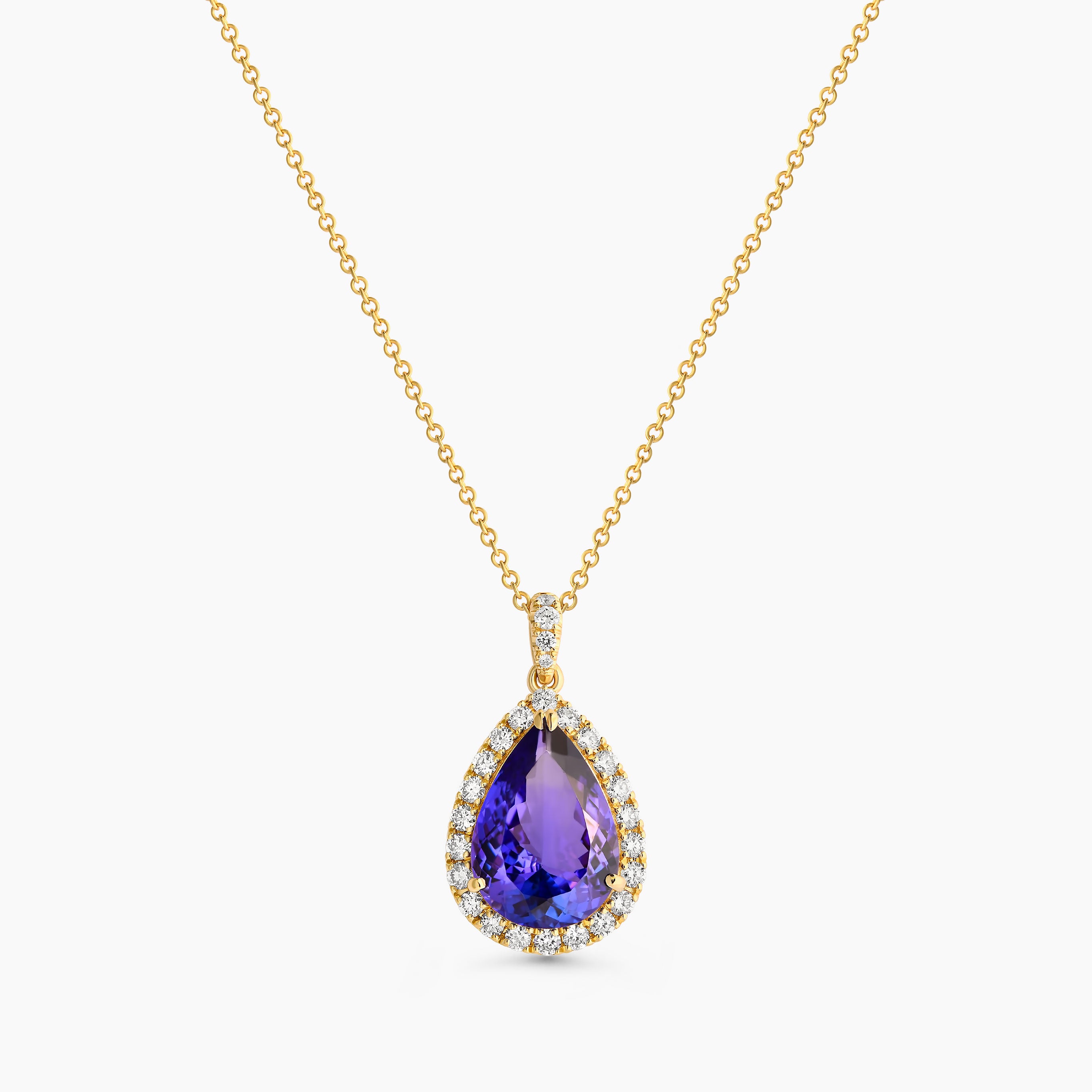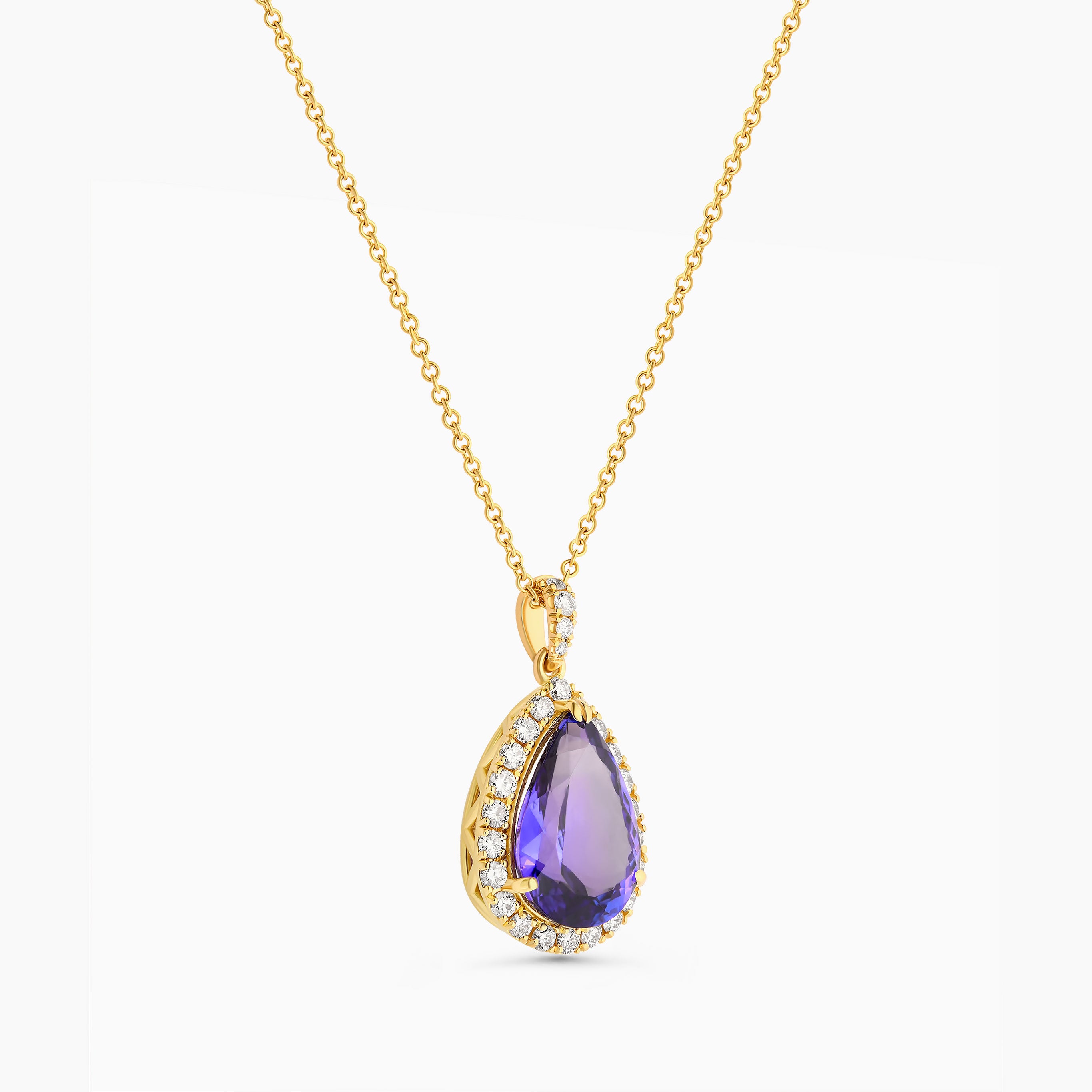 The Pear-Shaped Tanzanite and Diamond Halo Pendant showcases a stunning pear-shaped Tanzanite, celebrated for its captivating deep blue-purple hue. Surrounded by a sparkling halo of diamonds, the center stone is beautifully enhanced, creating a striking contrast that amplifies its vibrant color. The pendant is set in rich yellow gold, which complements the Tanzanite’s mesmerizing shade and adds a warm, elegant touch. A perfect balance of color, sparkle, and sophistication, this pendant is a truly unique and radiant piece.