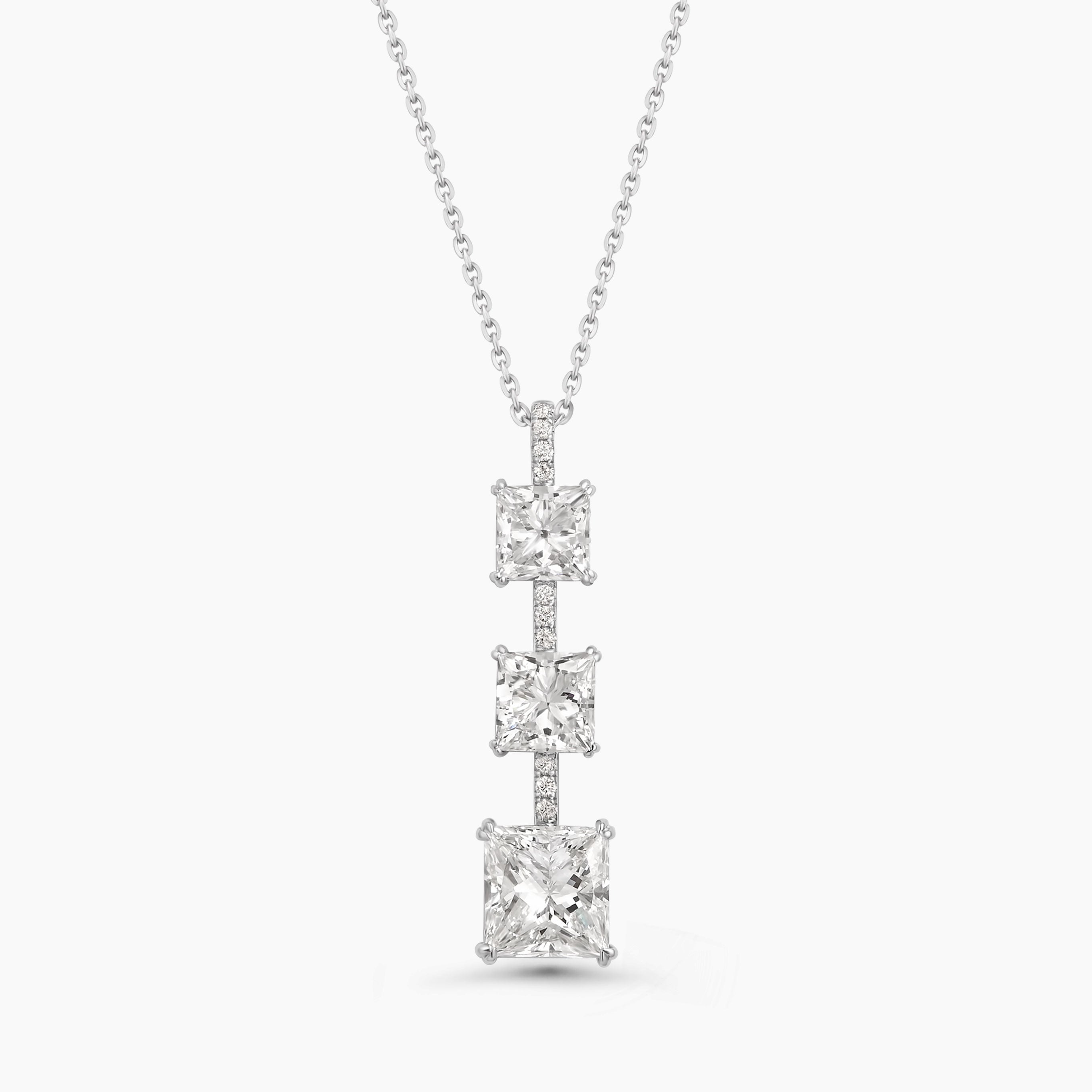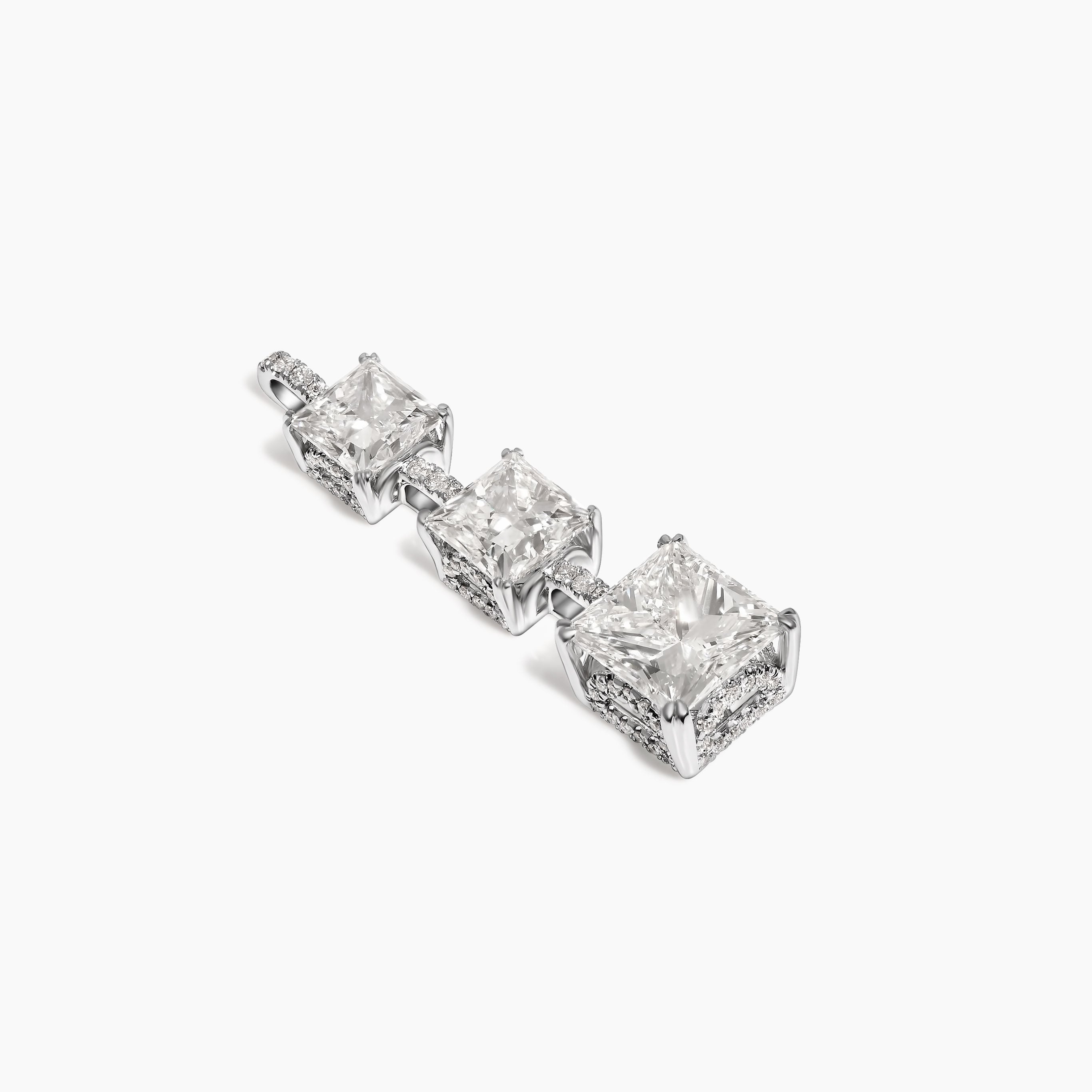 The Princess Cut Diamond Three-Stone Pendant is a masterpiece of design, expertly crafted to showcase approximately 17 ct. total weight of princess cut diamonds, along with 1.5 ct. of round brilliant cut diamonds. The sleek yet intricate design highlights the striking geometric beauty of the princess cuts, while the round diamonds add an extra layer of brilliance. From the sparkling bail to the edges of the pendant, every detail is carefully designed to create an extraordinary statement piece.