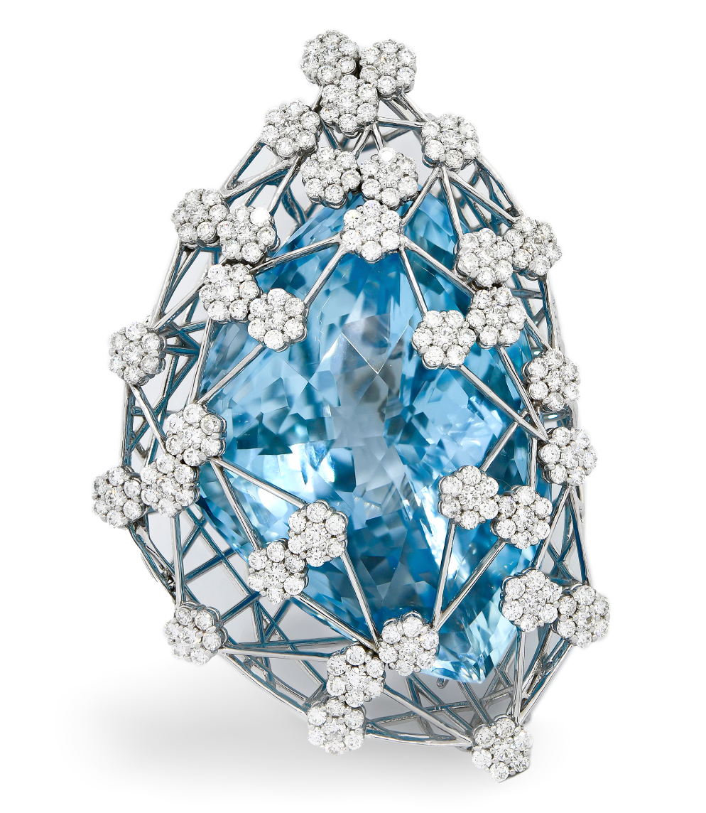 The Bird Nest pendant, designed and donated to the Crystal Ball charity event by the USC Arcadia Hospital Foundation, is a stunning symbol of care and generosity. Crafted in 14K white gold, the pendant features a beautifully special-cut blue topaz, totaling 229 carats, accented with diamonds. This exquisite piece supports USC Arcadia Hospital’s mission to enhance its programs and make a lasting impact on the lives of those it serves, helping to provide essential care and resources for the community.