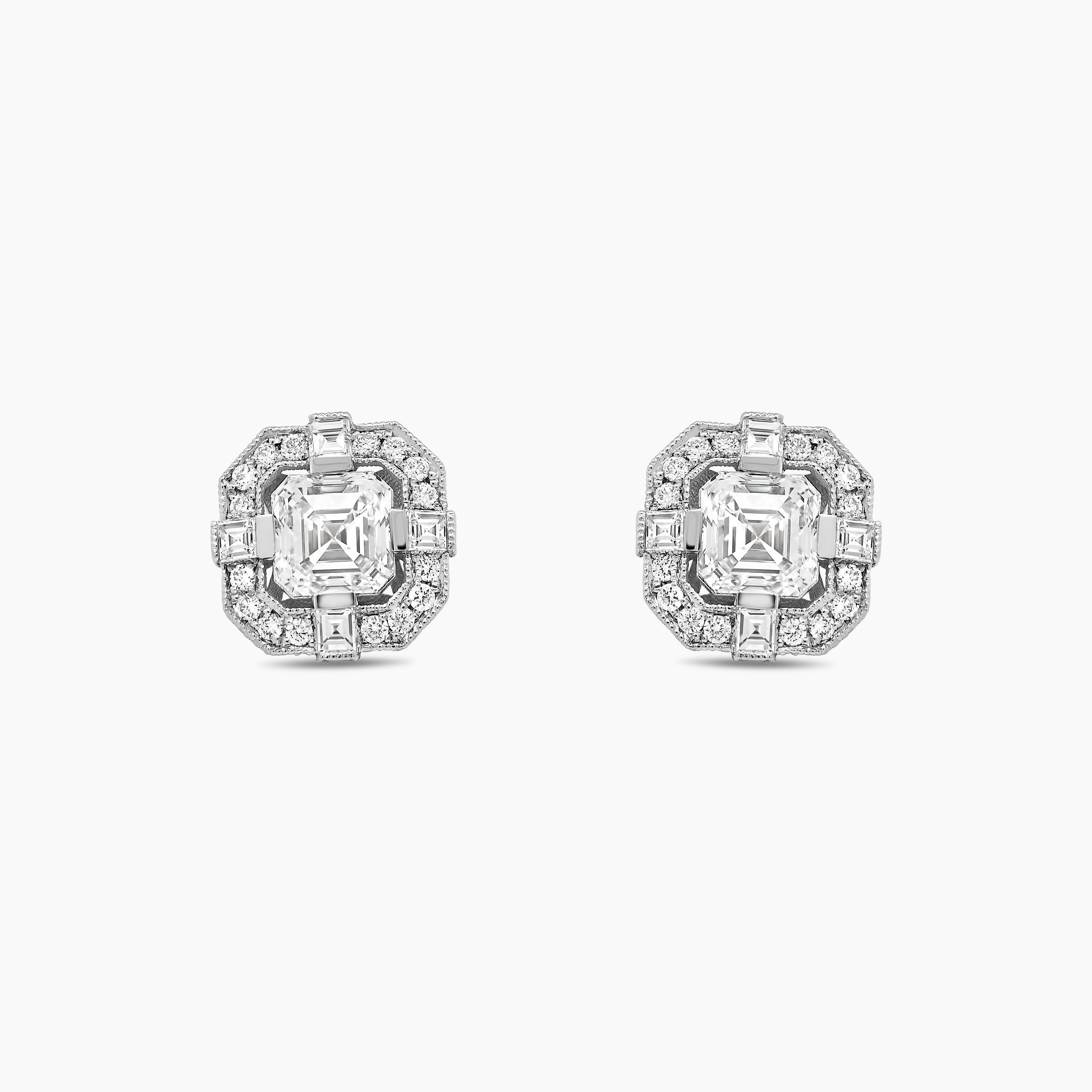 These earrings embody the opulence of the Art Deco era, crafted with asscher, baguette, and round cut diamonds intricately arranged in a mesmerizing geometric pattern. Bring a touch of classic sophistication to any outfit with these exquisite stud earrings.