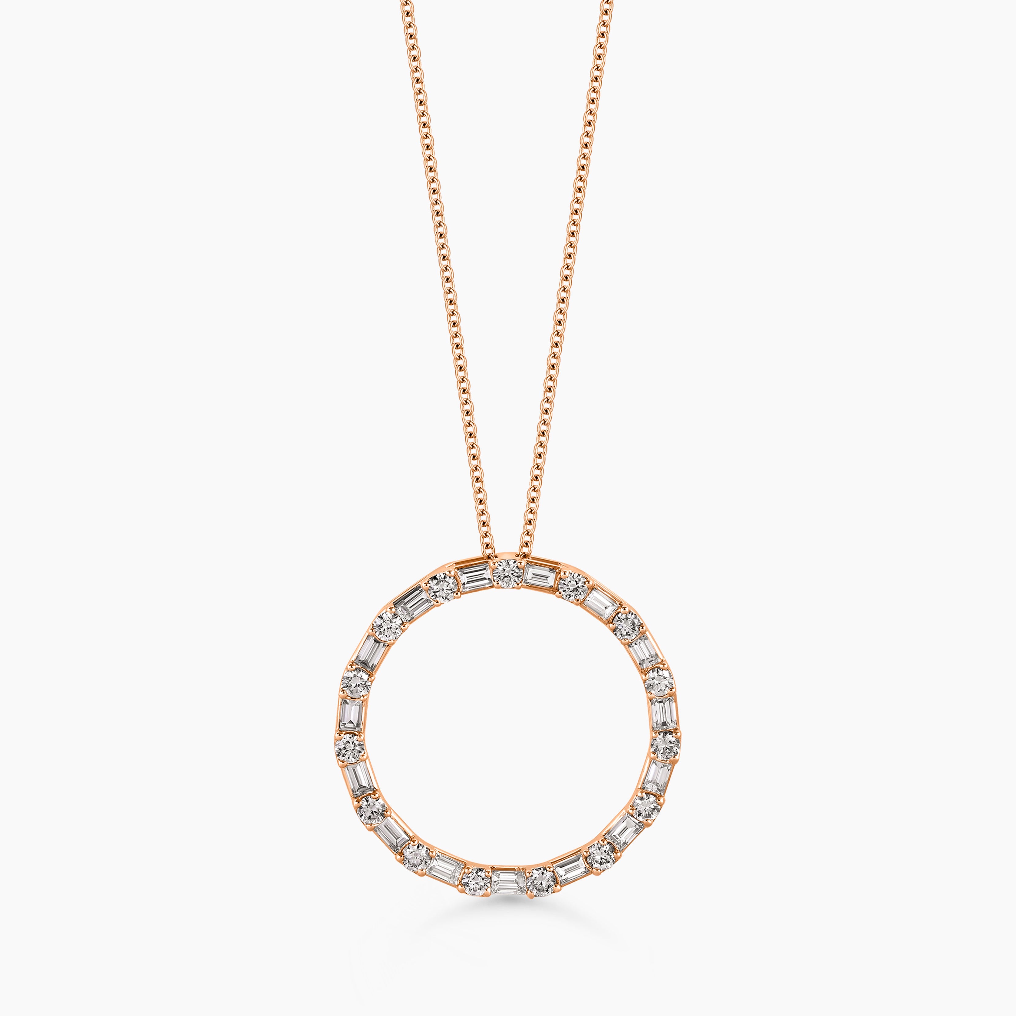 Featuring a combination of baguette and round cut diamonds, our elegant circle pendant offers a fresh twist on the classic design. This unique pendant exudes timeless elegance with a touch of modern aesthetics. The sparkling diamonds make it an ideal accessory for any occasion, adding a touch of simple yet sophisticated glamour.